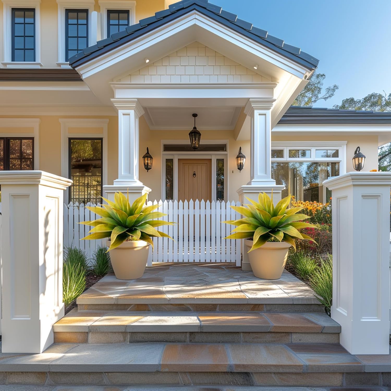 • 🌵About The Large Fake Plants Color: natural yellow , replica of the real agave color, delicate and durable, outdoor sun protection.Low Maintenance Unlike real plants, these artificial agave planters require no watering, pruning, or fertilizing. faux succulent outdoor plant enjoy the beauty of greenery without the hassle of maintenance.