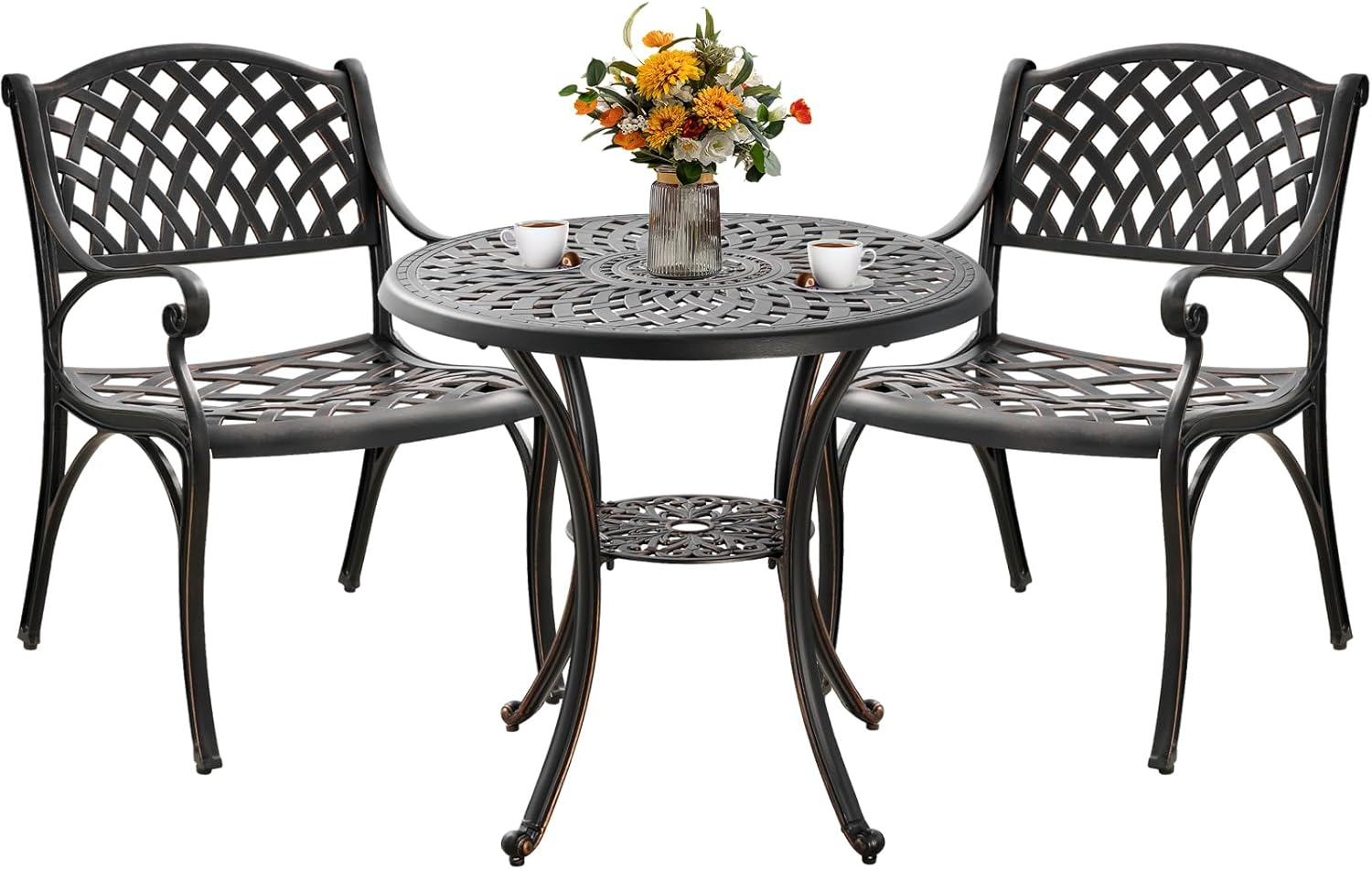 Bistro Set 3 Piece Outdoor Cast Aluminum Patio Bistro Set Patio Set Metal Bistro Table and Chairs Set of 2 with Umbrella Hole for Deck, Gardens, Bronze (Woven Backrest)