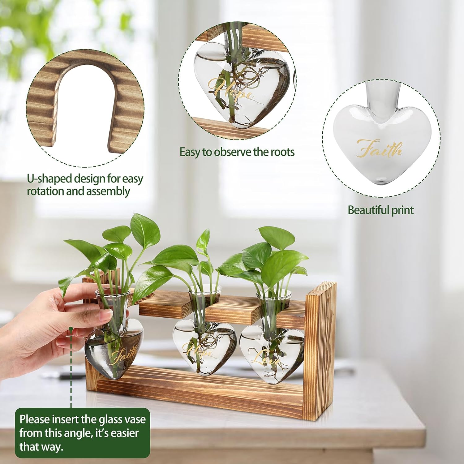 Plant Terrarium Propagation Stations Faith Hope Love Hydroponics Home Garden Decoration Gift for Women with Wooden Stand Heart Shaped Colored Glass Vase