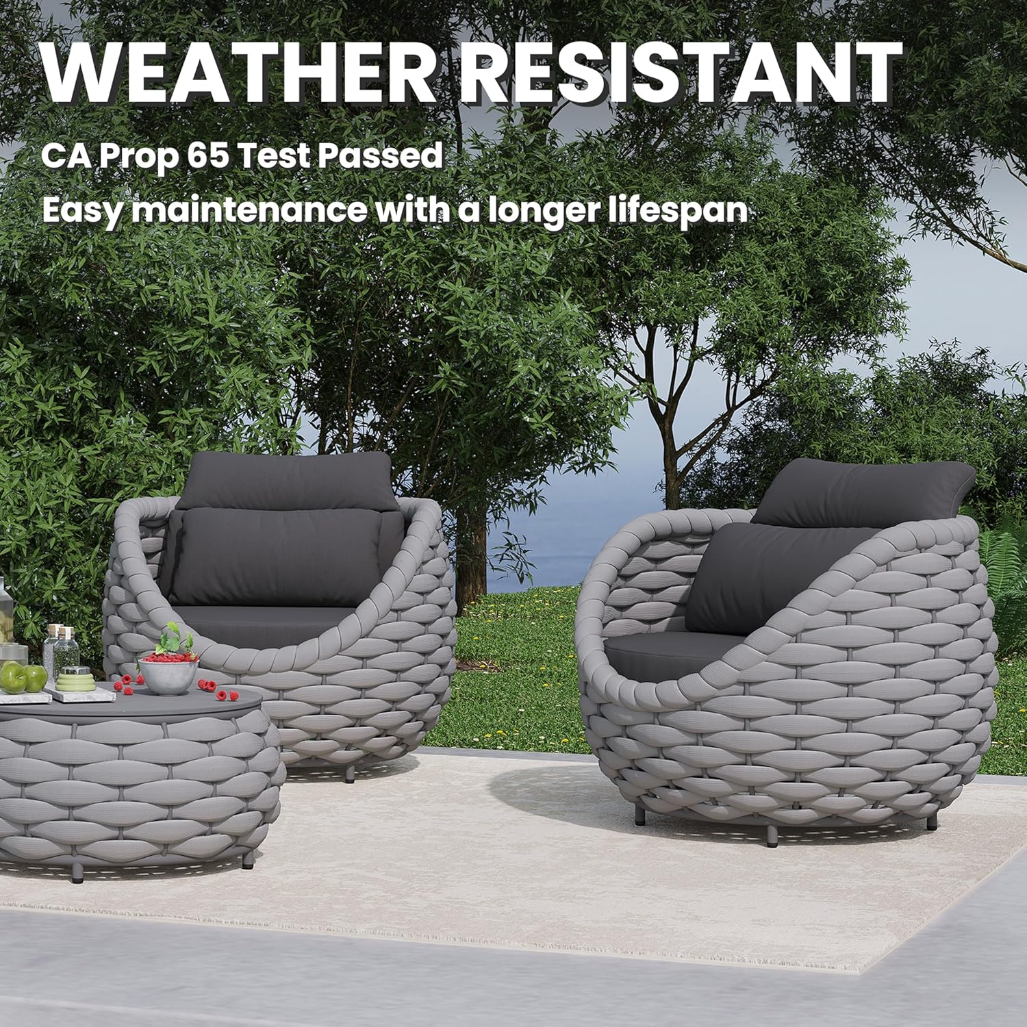 - Furniture set is crafted from reinforced rust-free aluminum frame, wrapped in Textilene hand woven rope. The 3 pieces all weather patio upholstered conversation set resists to UV, rain, wind, salt water. Perfect for indoor outdoor even arid or coastal areas