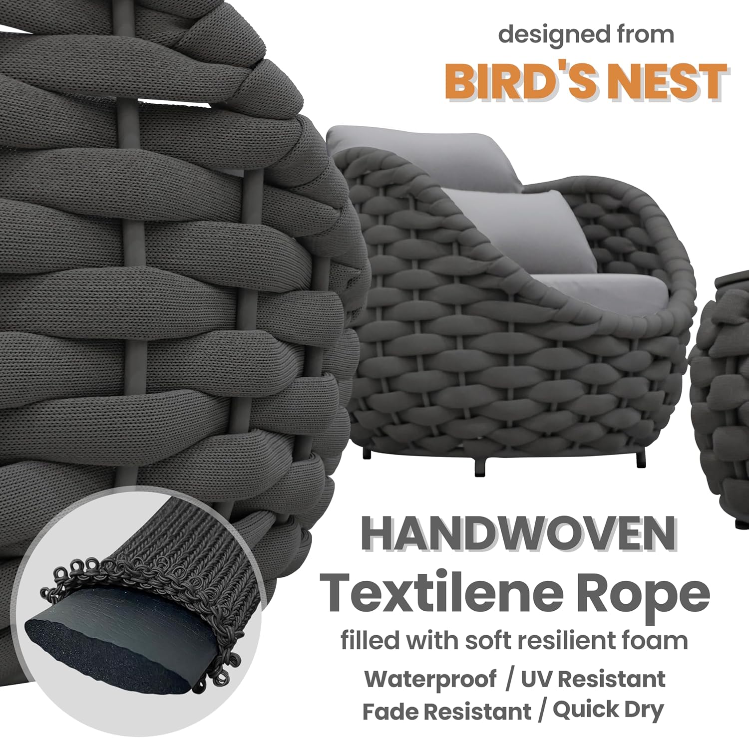 - Inspired by bird's nest cup shape, the Erotr assembled rope cushioned sofa armchair set for 2 combines comfort, elegance, and durability. Curved scoop armrest, supportive backrest and deep cushioning offer an enveloping ultimate relaxation