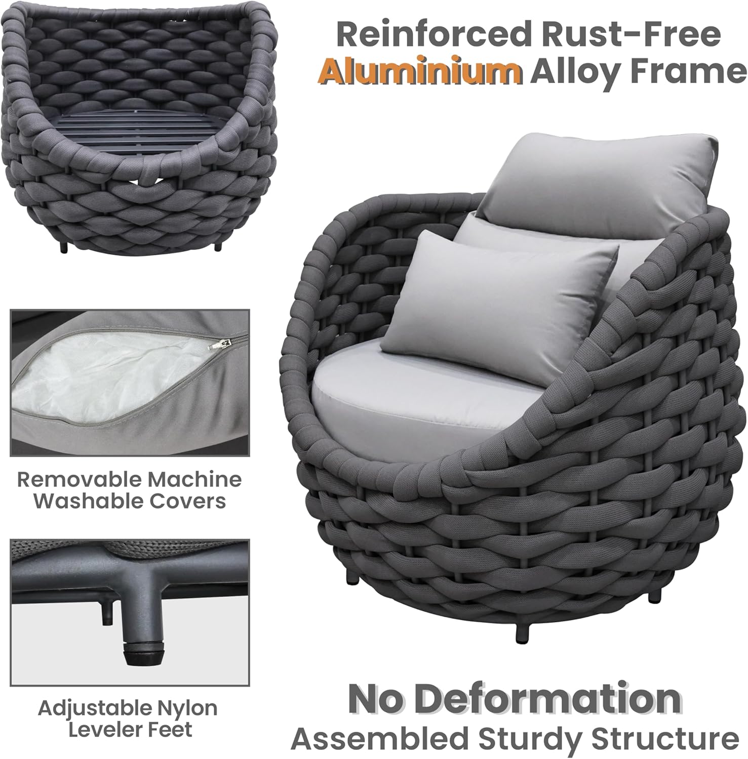 - Furniture set is crafted from reinforced rust-free aluminum frame, wrapped in Textilene hand woven rope. The 3 pieces all weather patio upholstered conversation set resists to UV, rain, wind, salt water. Perfect for indoor outdoor even arid or coastal areas