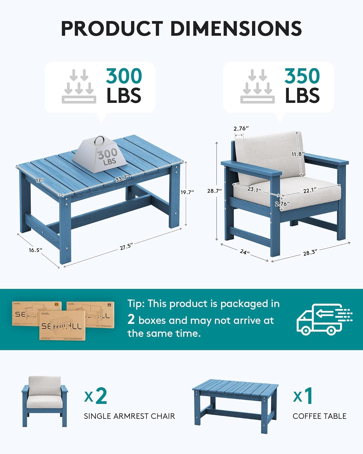 - What will you get: 2 outdoor single-seater sofas with khaki seat cushions and back cushion, a outdoor coffee table, which will be shipped in TWO packages. Enjoy SERWALL 3 Pieces patio bistro sofa set that's built to last, offering a comfortable and stylish space for relaxation and conversation.