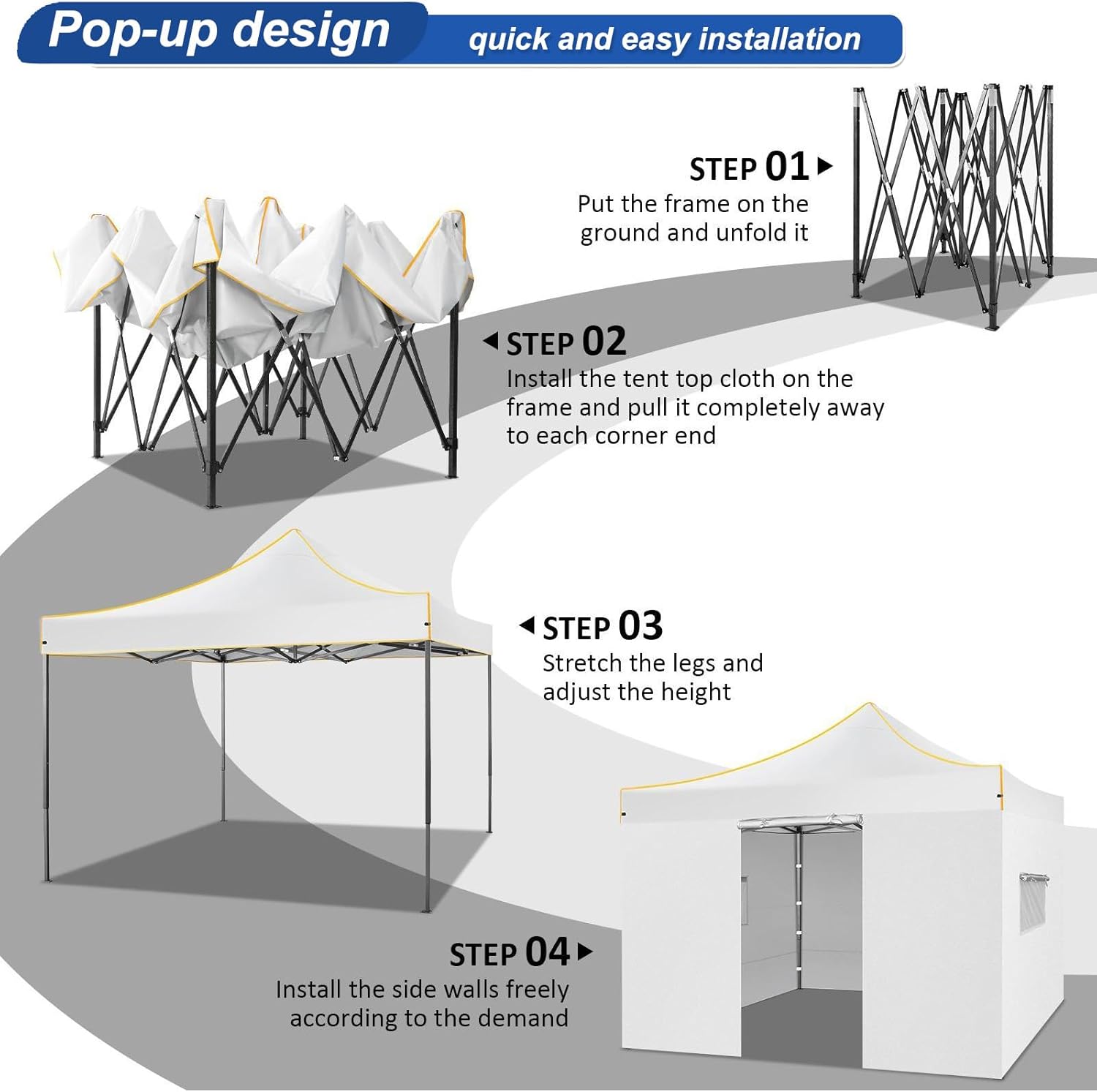 - [Installed in minutes] - Our canopy 10x10 is a pop-up type, the main body is linked in one, there is no splicing installation, and the sidewalls are installed as needed. Detailed instructions are also included. Two people can complete the tool-free installation in minutes.(Top service)- We will fully solve any problem products. We have private technical support experts, please feel free to contact us if you have any questions.