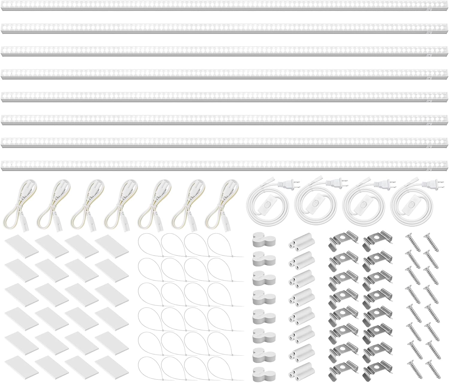 - What You Get: 8 x Barrina T5 Grow Lights, 4 x Power Cords with ON/OFF Switch, 7 x Connecting Cords (47.2''), 8 x Small Connectors, 16 x Installation Clips, 16 x Double-sided Tapes, 24 x Cable Ties, 8 x Dustproof Cap