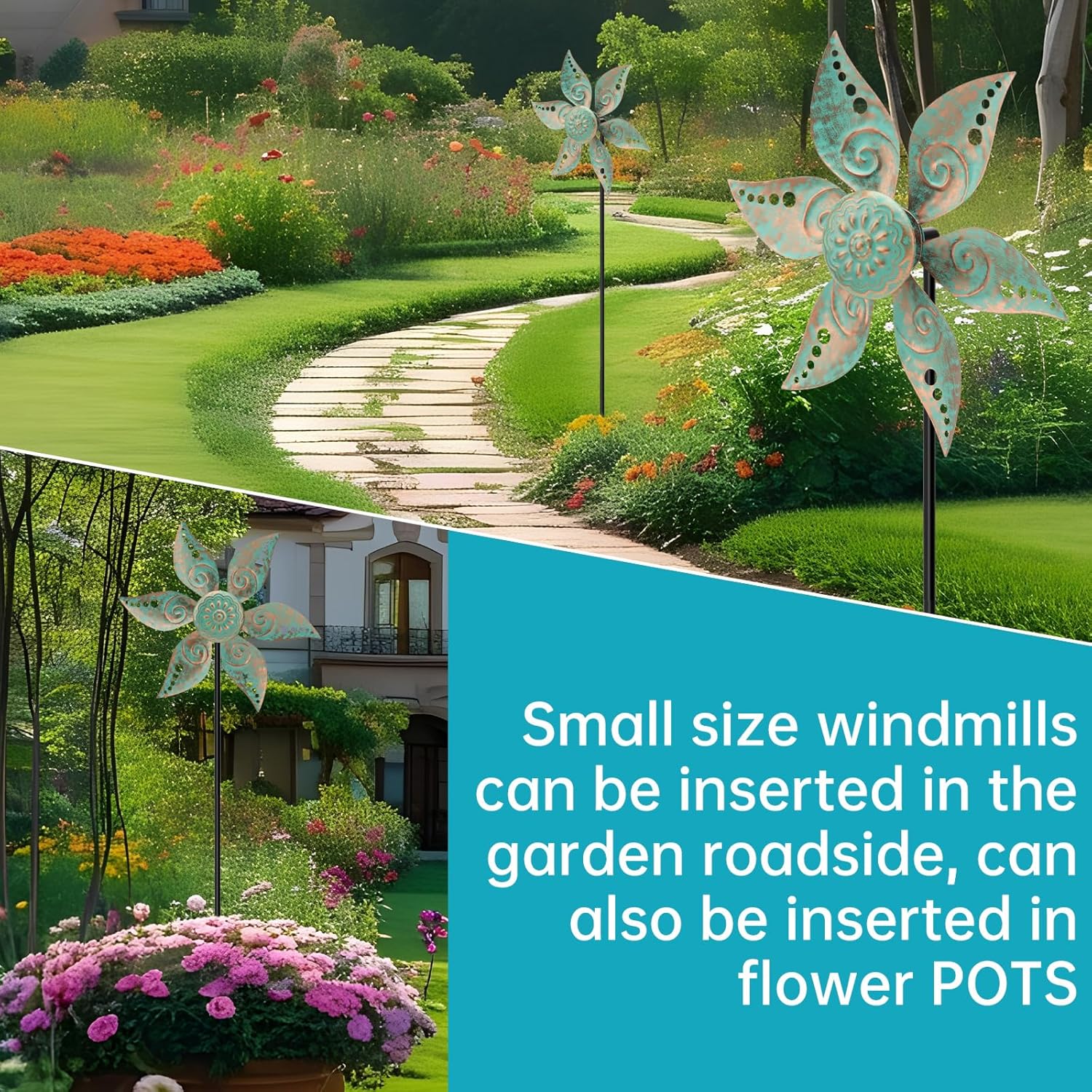 - Special shape design: Vintage design metal garden windmill,Garden spinner is painted with Green pigment , It is made of sturdy metal construction and weatherproof bronze powder coating, sturdy and durable, perfect for outdoor use as a beautiful decoration. When it starts to rotate, it will be like a flower blooming in the wind, bringing your garden to life