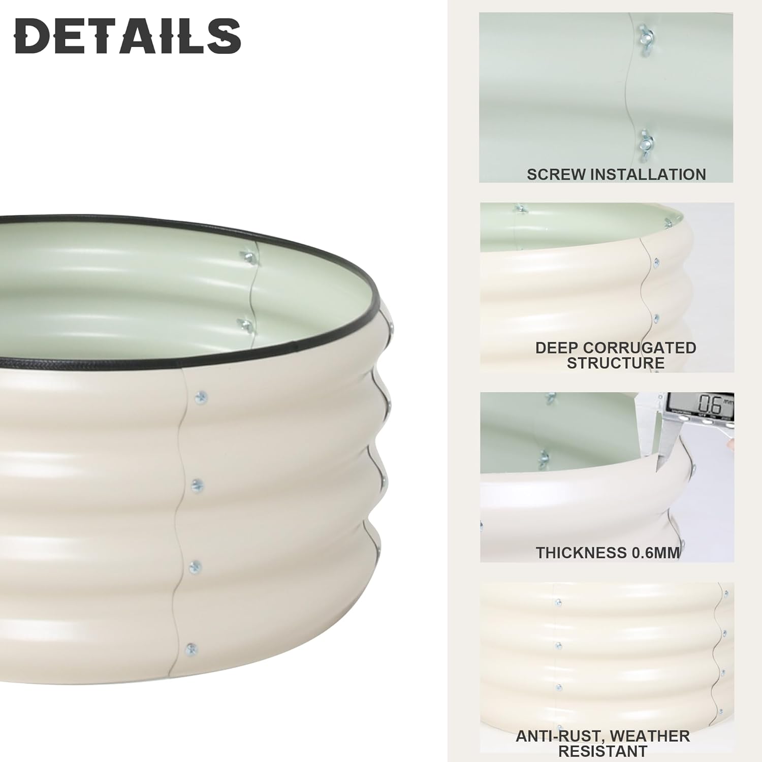 - Durable Material: This robust and durable planter box is constructed from high-quality galvanized steel, featuring a wall thickness of 0.6 millimeters. The surface is treated with an anti-rust coating, while the overlapping sections achieve a maximum thickness of 1.2 millimeters. For your convenience, the product includes a screwdriver and gloves.The black rubber sealing edge not only effectively prevents hand injuries but also enhances both the stability and aesthetic appeal of the flower bed