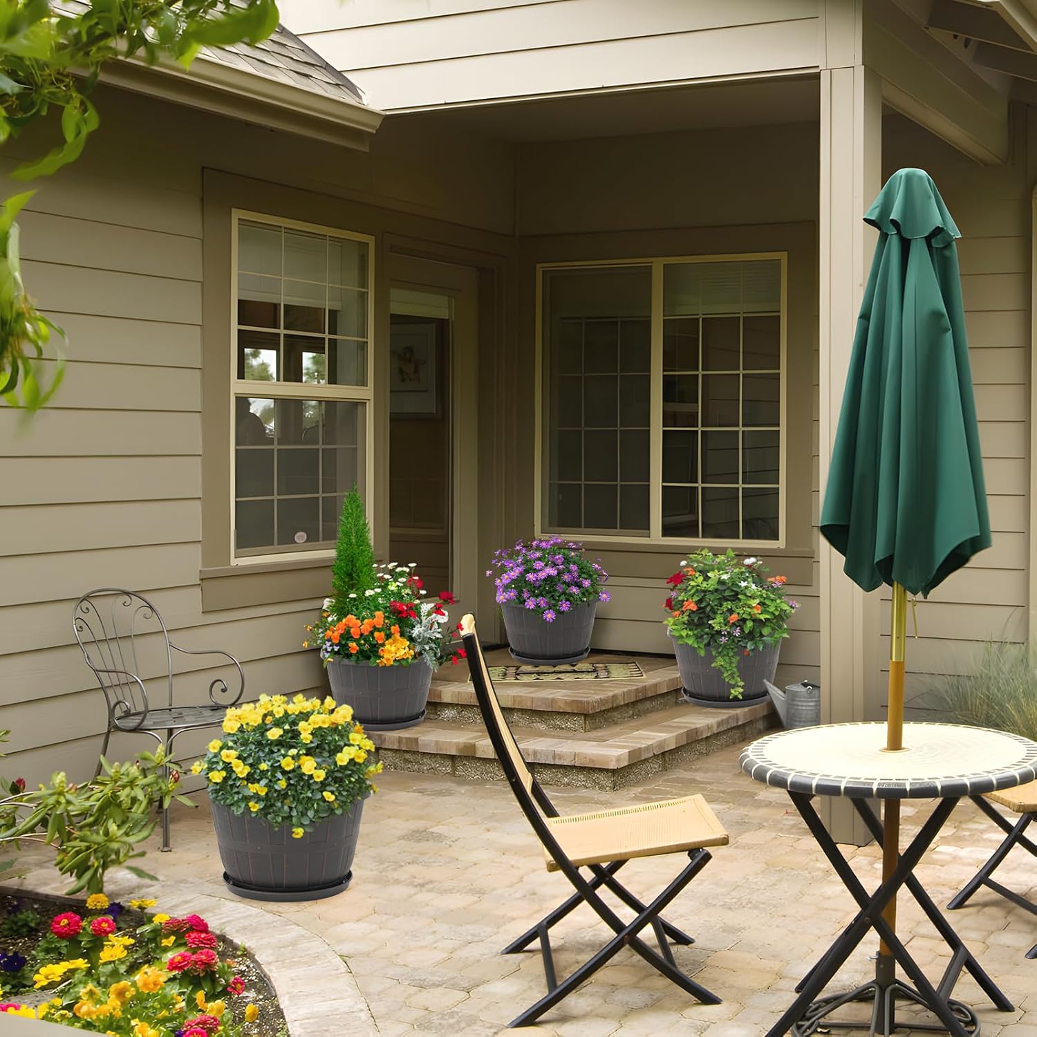 • 【Unique Design】The whiskey barrel planters stands out with its simple texture and classical design mimicking a wine barrel. This distinctive design of the plant pots with drainage holes not only sets your planter apart but also adds a touch of sophistication to indoor or outdoor spaces.