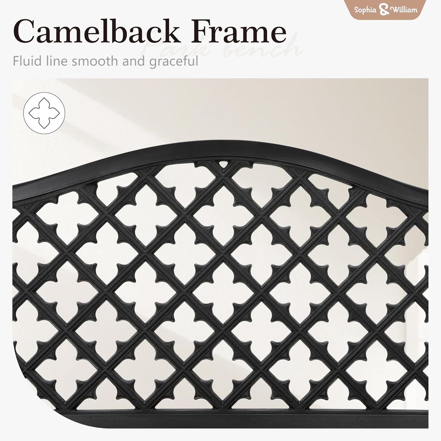 Sophia & William Outdoor Bench, 50 inches Metal Garden Bench, Cast Iron Park Benches for Outside with Floral Backrest and R-Shaped Legs for Porch Yard Lawn Deck, Black