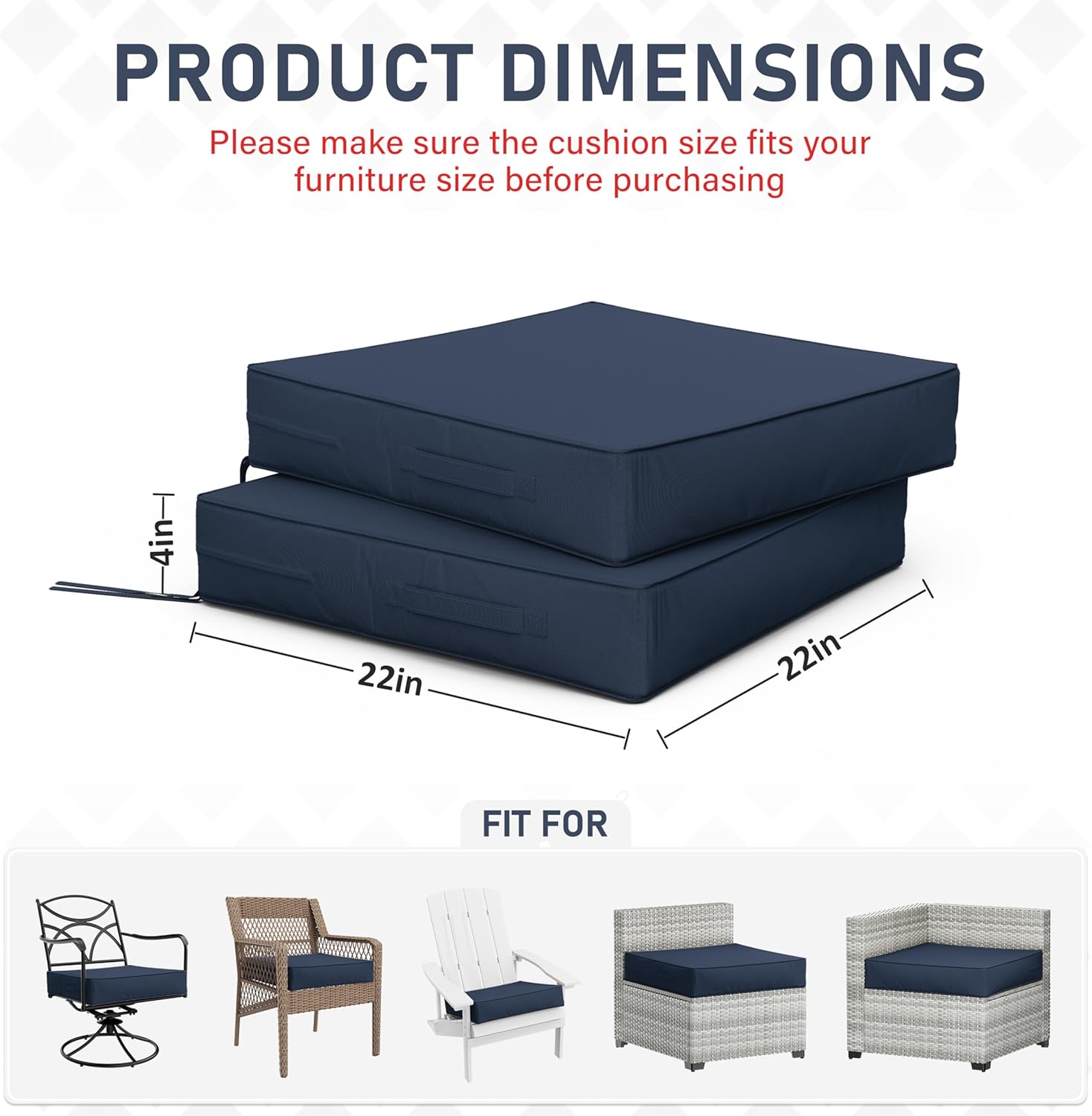 Patio Chair Cushions 22 X 22 X 4 Inch Waterproof Outdoor Seat Cushions for Patio Furniture, Outdoor Sofa Couch Pads with Ties & Handle, Set of 2, Navy Blue