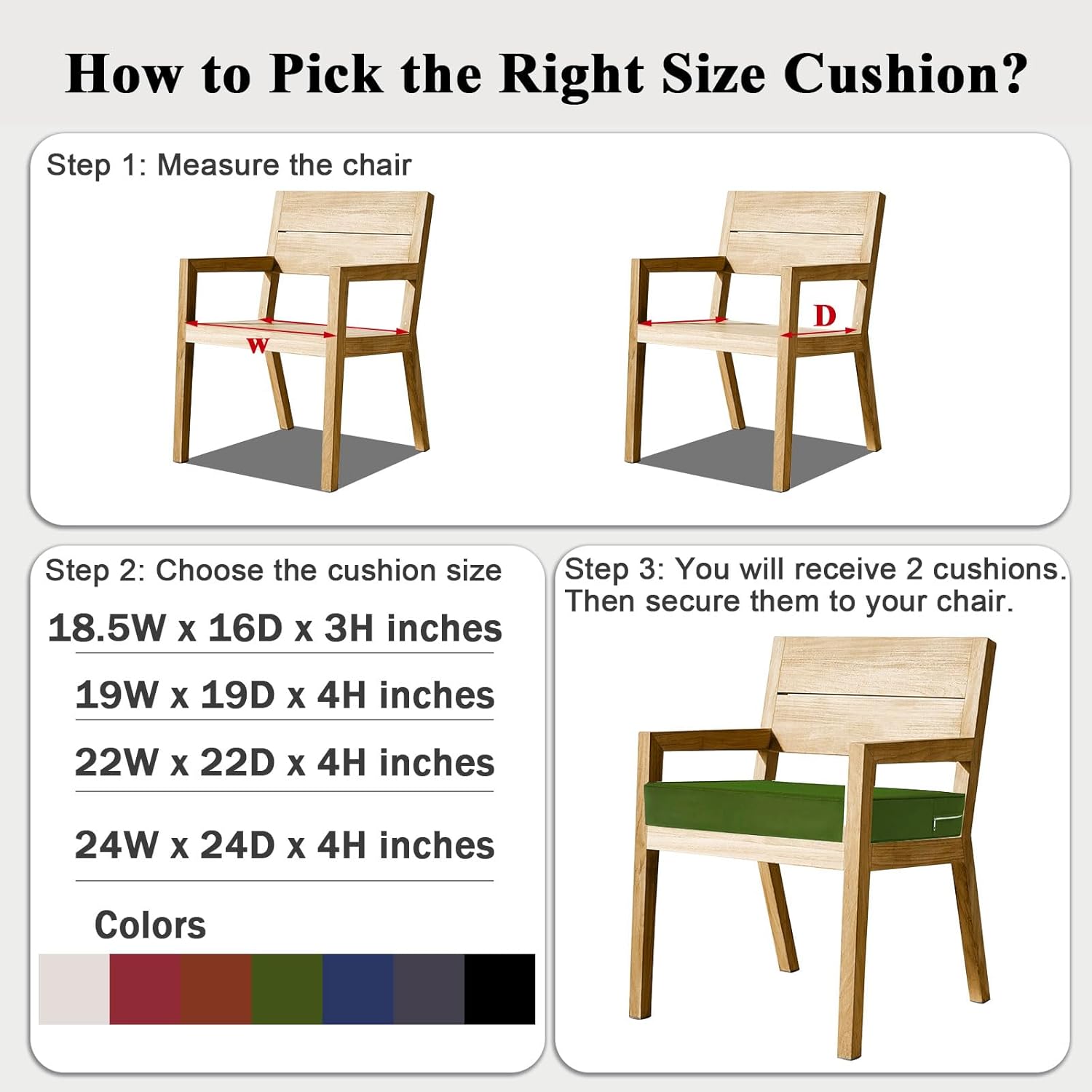 - PERFECT SIZE: Outdoor chair cushion set includes 2 cushions. Cushions measure: 19 inch (W) 19 inch (D) 4 inch (H). Fits most standard size outdoor chairs. Since the outdoor cushions are vacuum-packed, it may take 24-50 hours for the cushion foam to fluff back up after opening the vacuum bag