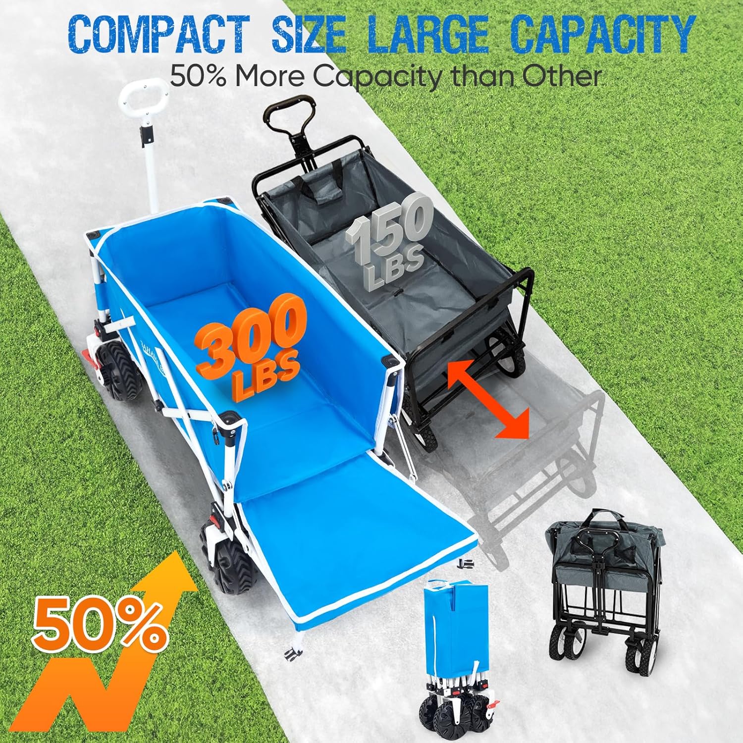 - 【Heavy-Duty Construction with 300lbs Capacity】Built with a durable steel frame and reinforced structure, this wagon can support up to 300lbs on flat surfaces. Its robust design ensures it can handle heavy loads, whether you're at the beach, park, or garden.