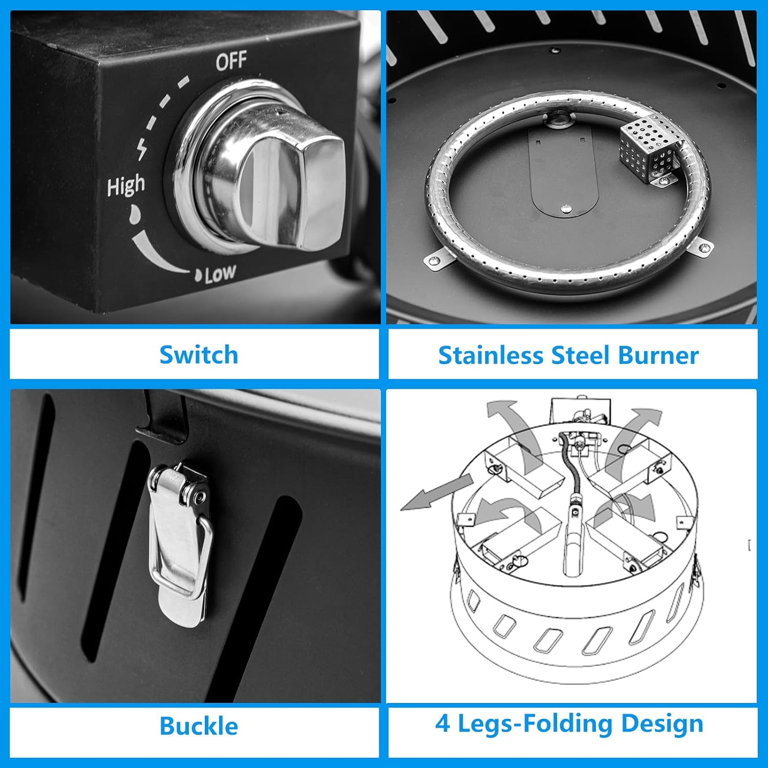 - [Compact and Easy Carry]: Travel size gas fire pit is lightweight and portable; easily set up in minutes with no tools required. The lid of fire pit comes with a handle, so you can carry it away without a bag. The 4 legs of propane fire pit are foldable design, more efficient storage space.Equipped with a gas tank supoort which keep tank not tip over.