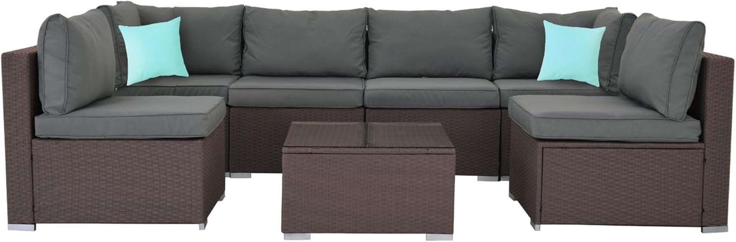 7-Piece Patio Furniture Set - Outdoor Sectional Sofa Set with Cushions and Glass-Top Coffee Table for Gardens, Poolside, Backyards and Porches, Wine/Grey