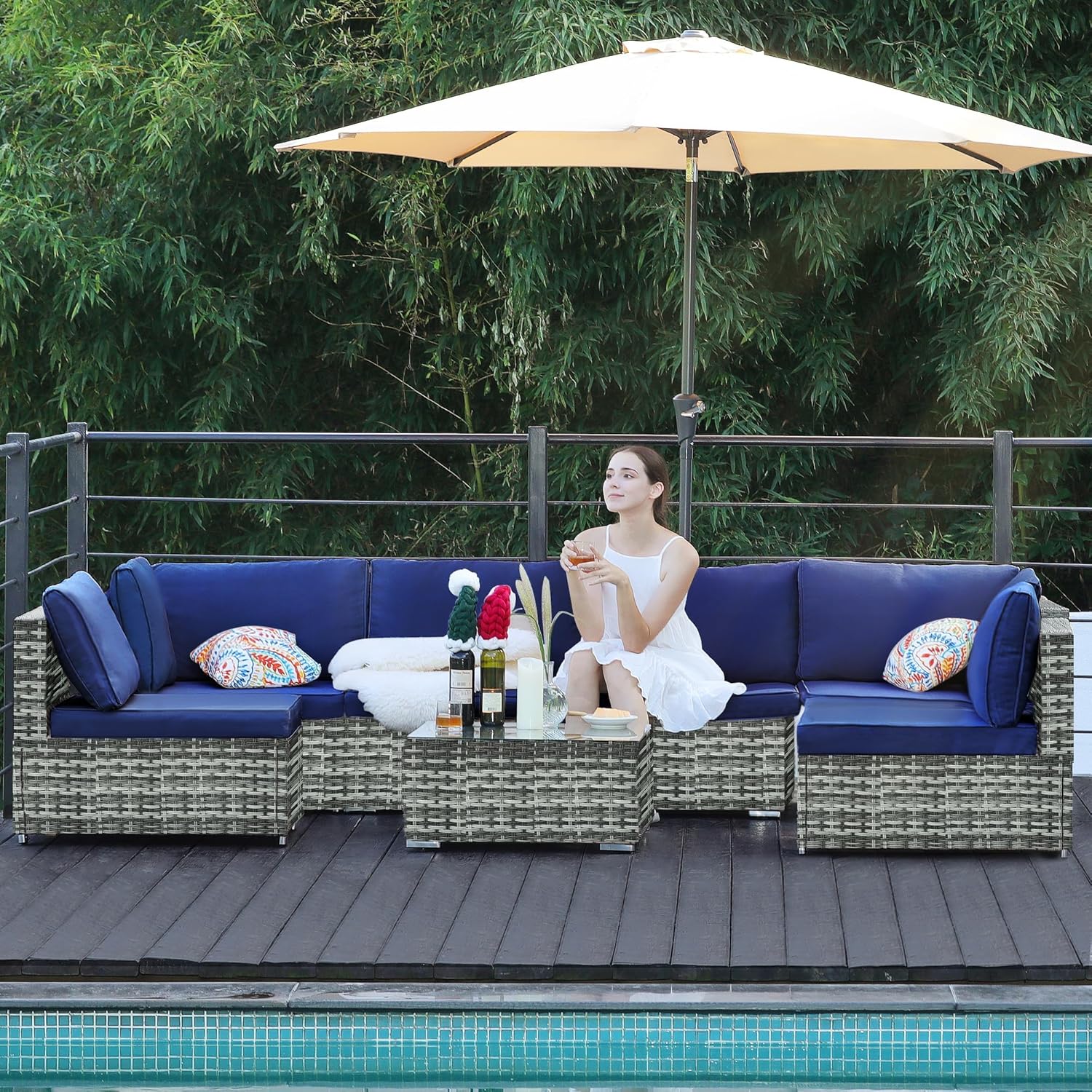 7-Piece Patio Furniture Set - Outdoor Sectional Sofa Set with Cushions and Glass-Top Coffee Table for Gardens, Poolside, Backyards and Porches, Grey/Navy Blue