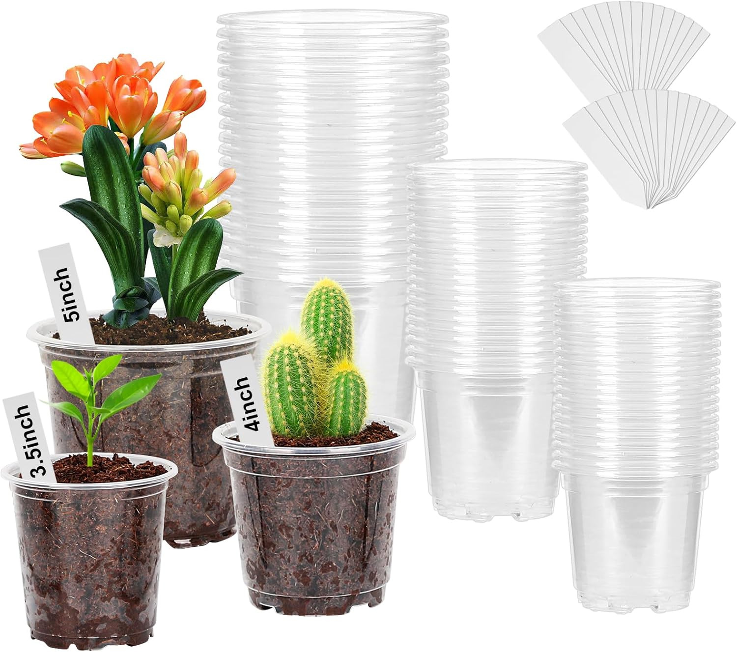 - Package Include: You will receive 60 pack clear plastic pots in different sizes ,includes 20pcs 3.5" plant pots, 20pcs 4" plant pots, 20pcs 5" plant pots, and 50 plant labels giveaways. Notice : plants are not included