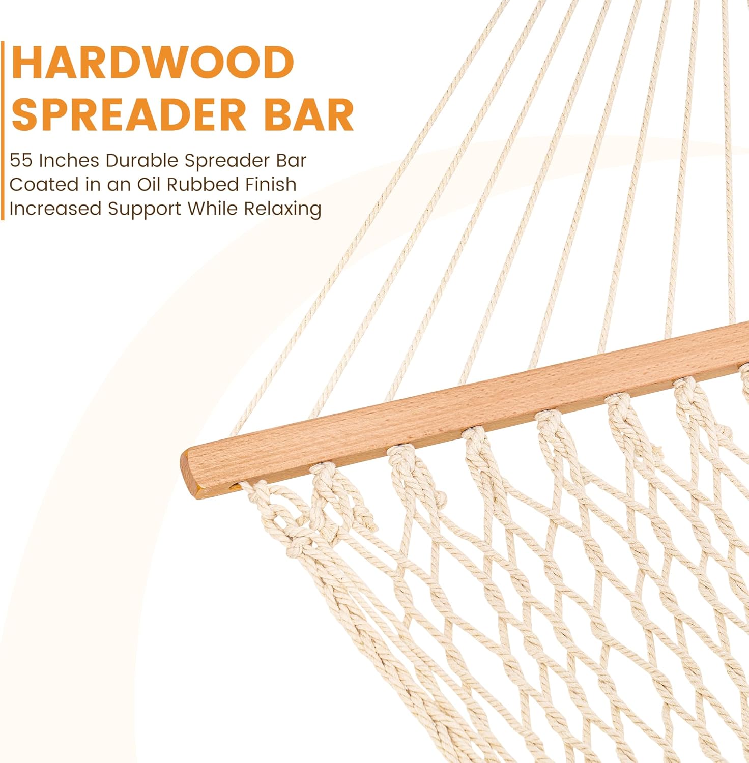 - STURDY AND RELIABLE: The sturdy hardwood spreader bars ensure stability and durability. The double rope hammock comes with tree-friendly high-density nylon straps and 2 carabiners, which makes it easy to set up and take down the hammock without damaging the trees