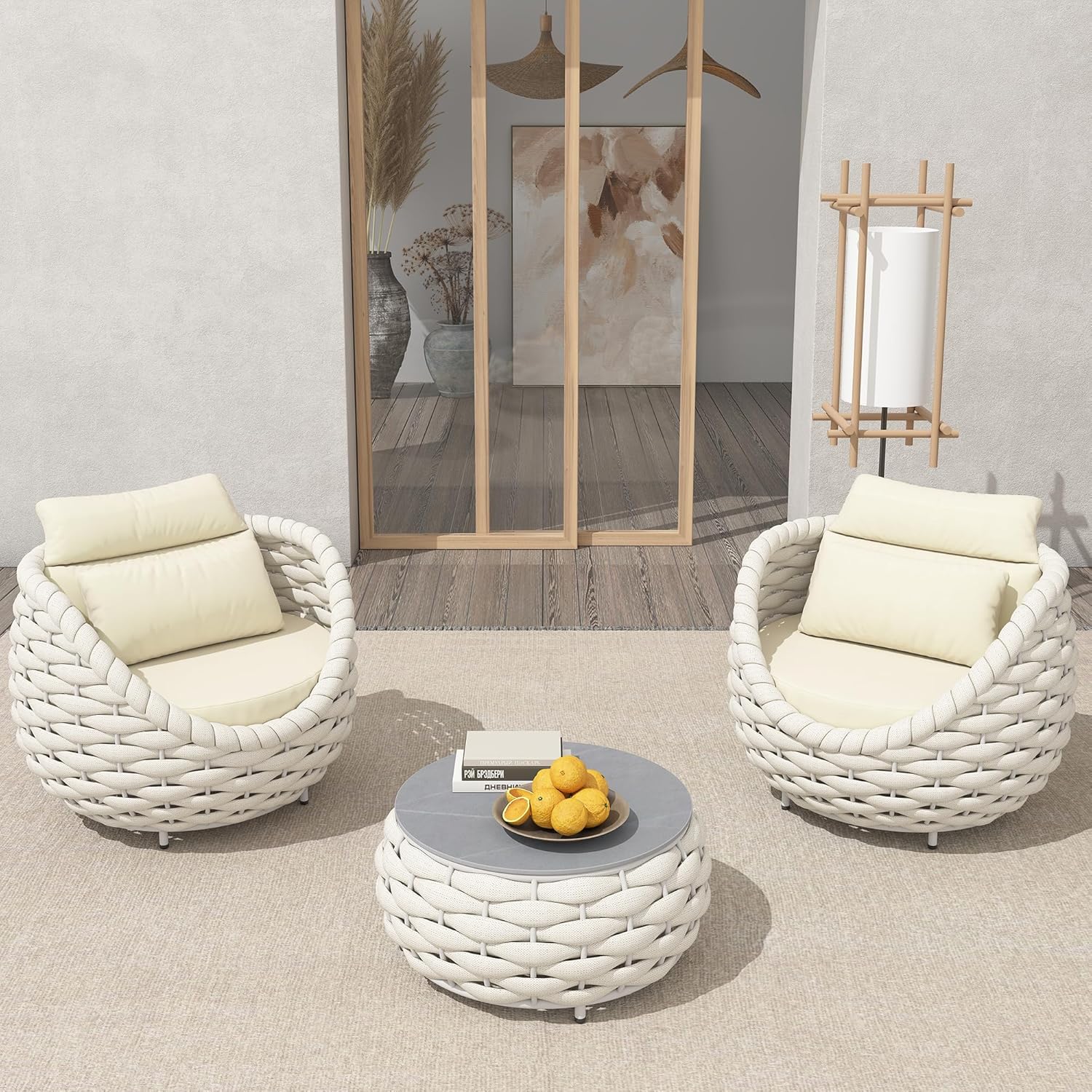 TWT Outdoor 3-Piece Conversation Set Rust Free Patio Furniture Set Already Assembled Compact-Weave Rope Olefin Modern Sofa Seating with Thick & Washable Cushions for Indoor, Backyard, Balcony, Cream