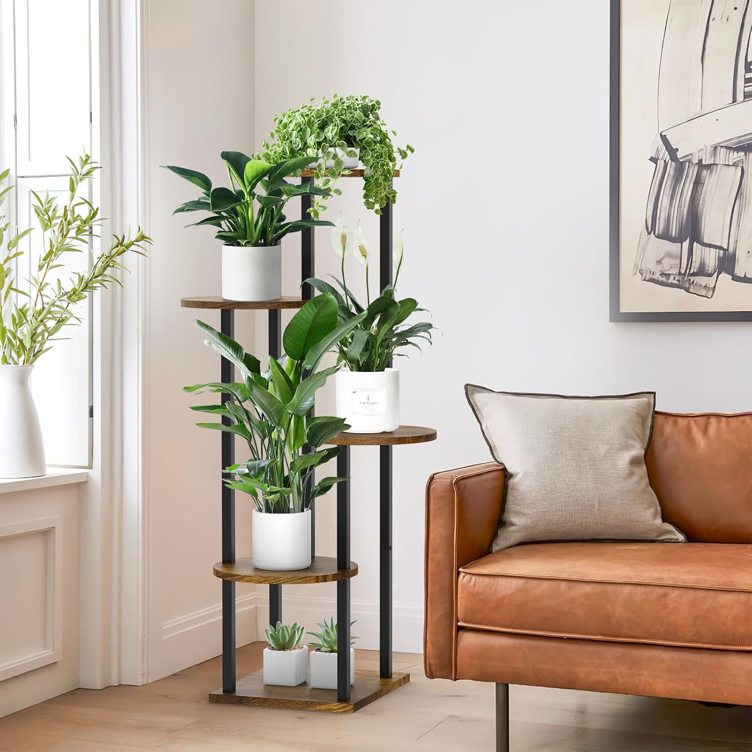 - Space-Saving Design: Our indoor plant stand occupies only 11.8 x 11.8 inches of floor space while effectively utilizing vertical space, making it an excellent choice for tight corners and small spaces
