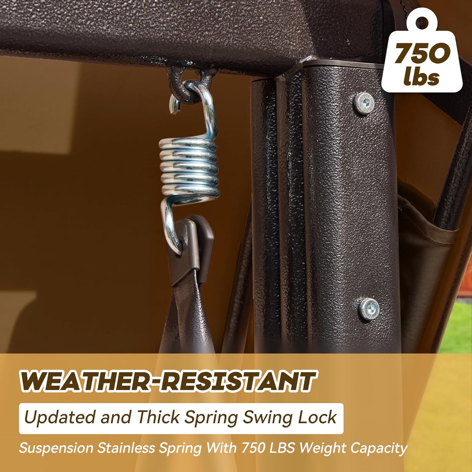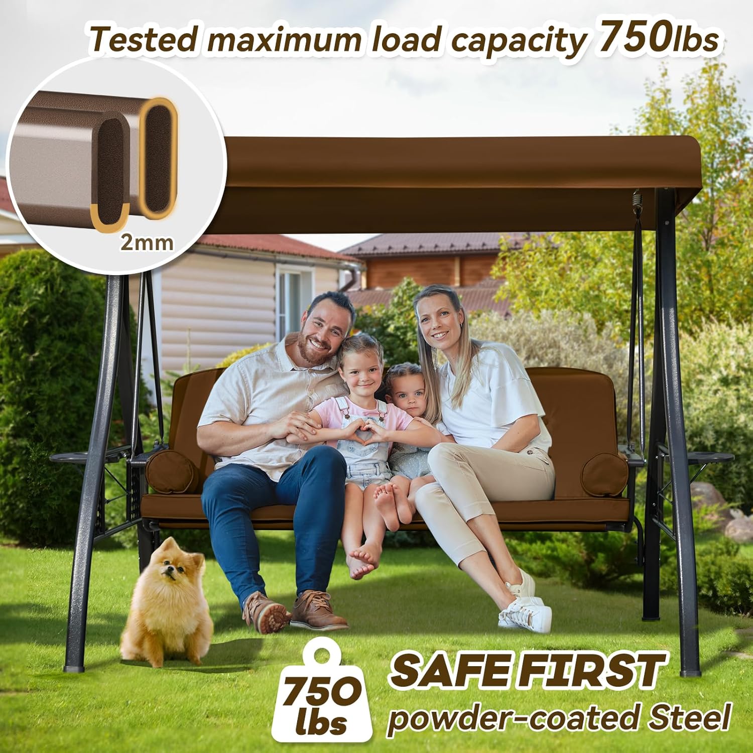 - ăSturdy and Safe Constructionă: The maximum weight capacity of porch swing is 750 pounds, our glider swing is designed for 3 adults to sit comfortably. The swing outdoor has a reliable buckle on backrest, ensuring stability and preventing any unwanted swinging. The double protection of 3 seat garden swing is designed for preventing accidental tipping.