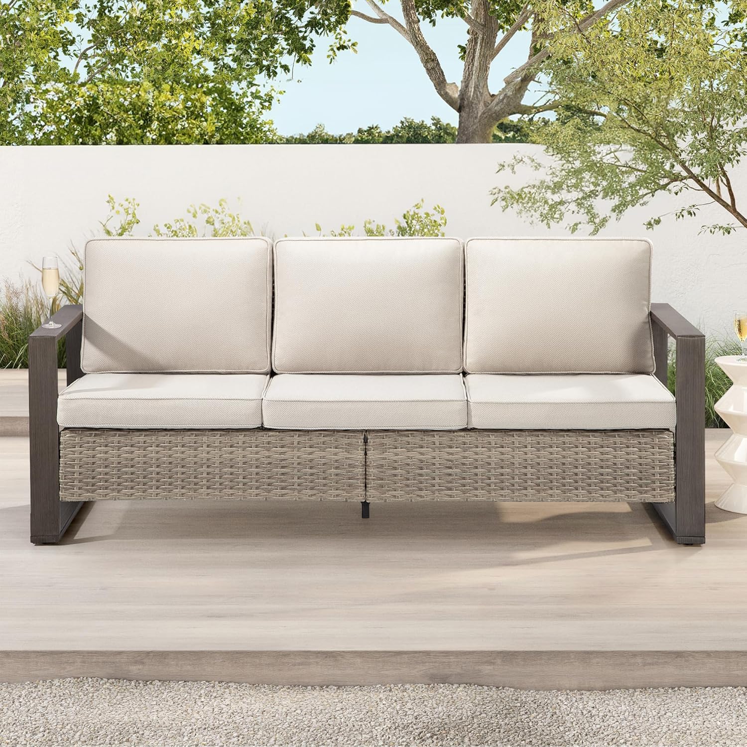 Joyside Outdoor Patio Wicker Sofa, 3-Seater Rattan Sofa with Thick Olefin Cushions and Metal Steel Rectangular Framed Armrest -Looking Metal Armrest Suitable for Garden, Backyard, Porch, Deck (Beige)
