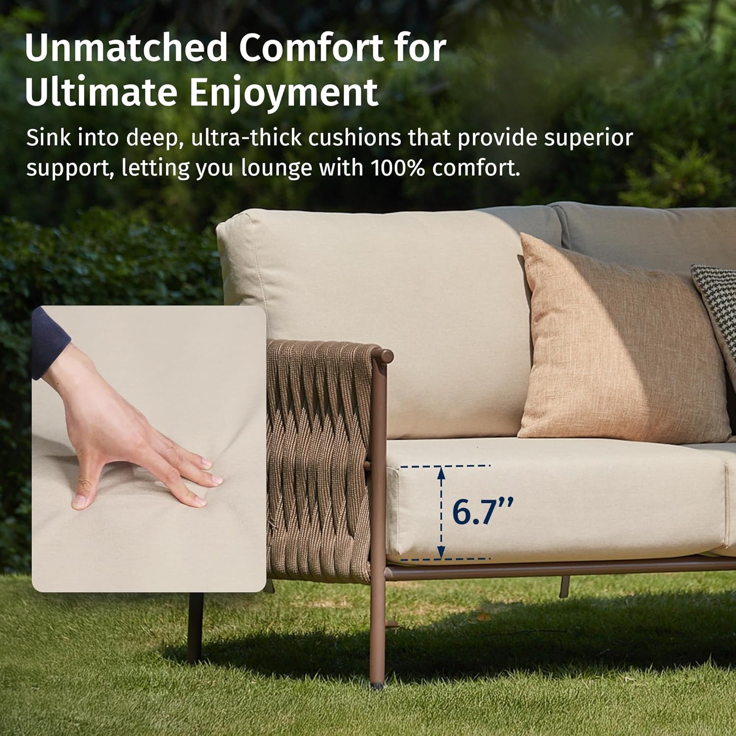 - EXTRA-THICK CUSHIONS FOR ULTIMATE COMFORT: Sink into 6.7-inch high-density foam cushions for deep, lasting support and relaxation. Designed for long hours outdoors, the ergonomic design maximizes comfort, while the removable, washable covers keep your sofa fresh and easy to maintain