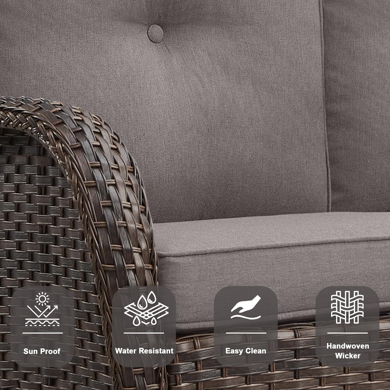 - 4.LUXURIOUS OUTDOOR RETREAT ENSEMBLE: Relax in the beautiful outdoors with this perfect 6 pieces patio glider furniture set. Our patio swivel rocker chair set with high quality foam cushion, comfortable and soft rebound good. The cushion cover is made of olefin outdoor water-resistant fabric. The seat and backrest are made of beautifully woven wicker coupled with ergonomic design, making it a classic upgrade for any porch, deck or patio.