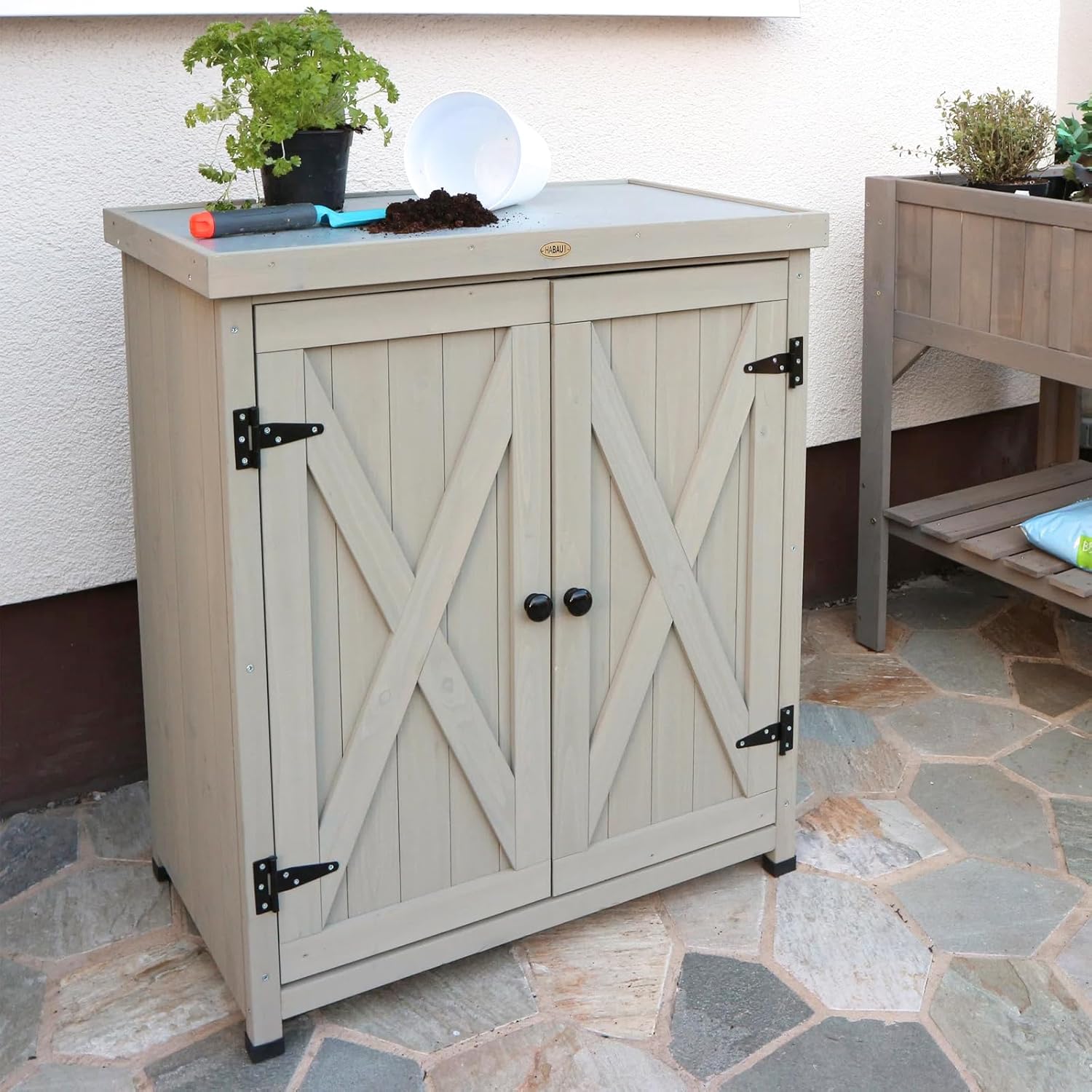 - Spacious Metal Worktop: The rust-proof metal surface is easy to clean and ideal for outdoor tasks, whether it’s gardening or preparing food for a BBQ. It’s the perfect outdoor cabinet for patio activities