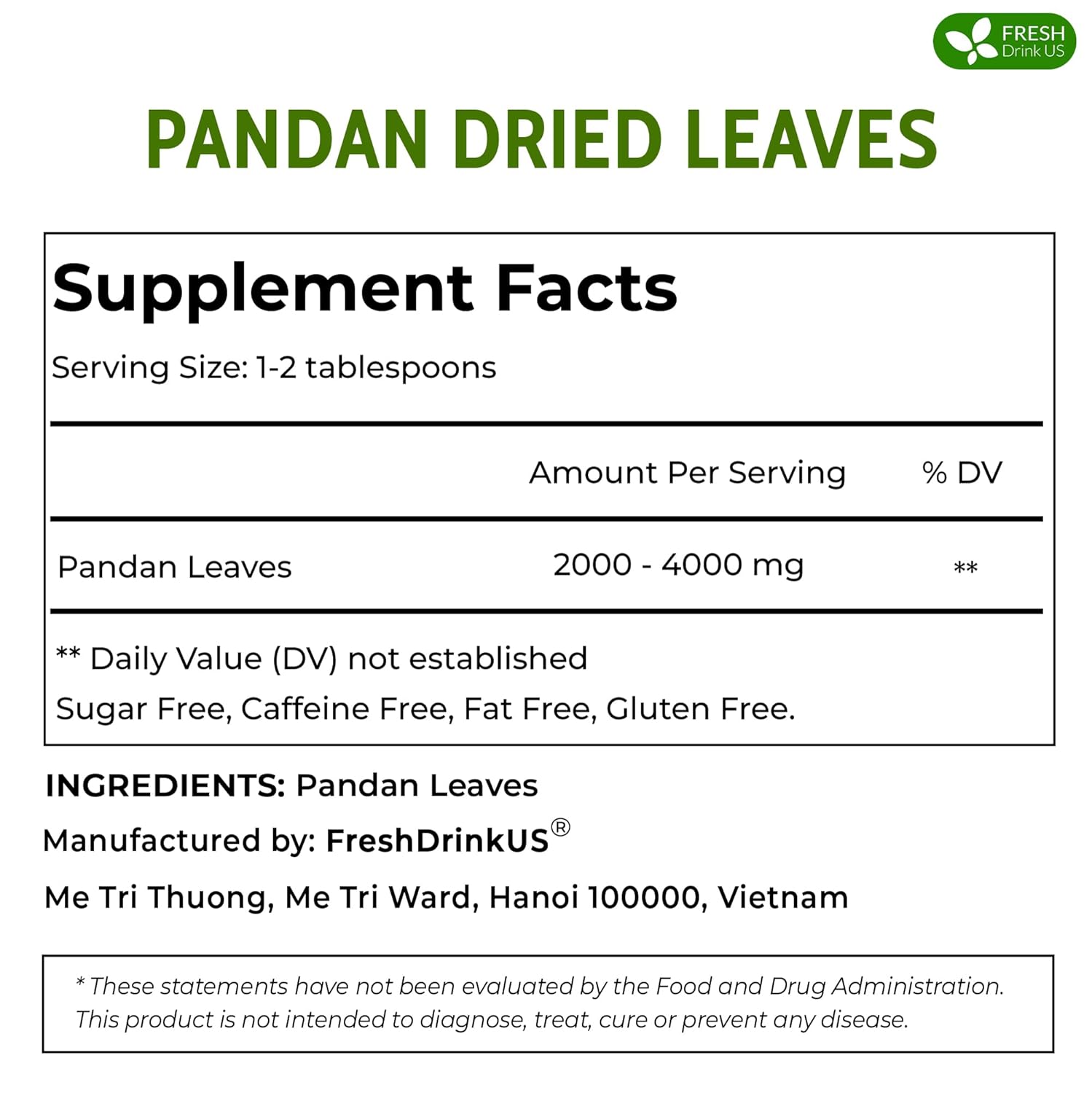 FreshDrinkUS, Premium 2oz Natural Pandan Leaves Dried, 100% Pure Dried Pandan Leaves, Pandan Leaf Tea, No Additives, No Caffeine, Vegan (2 oz Dried Leaves)