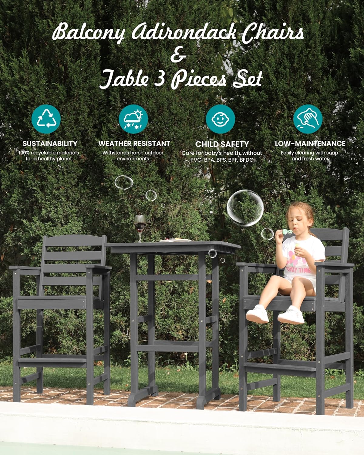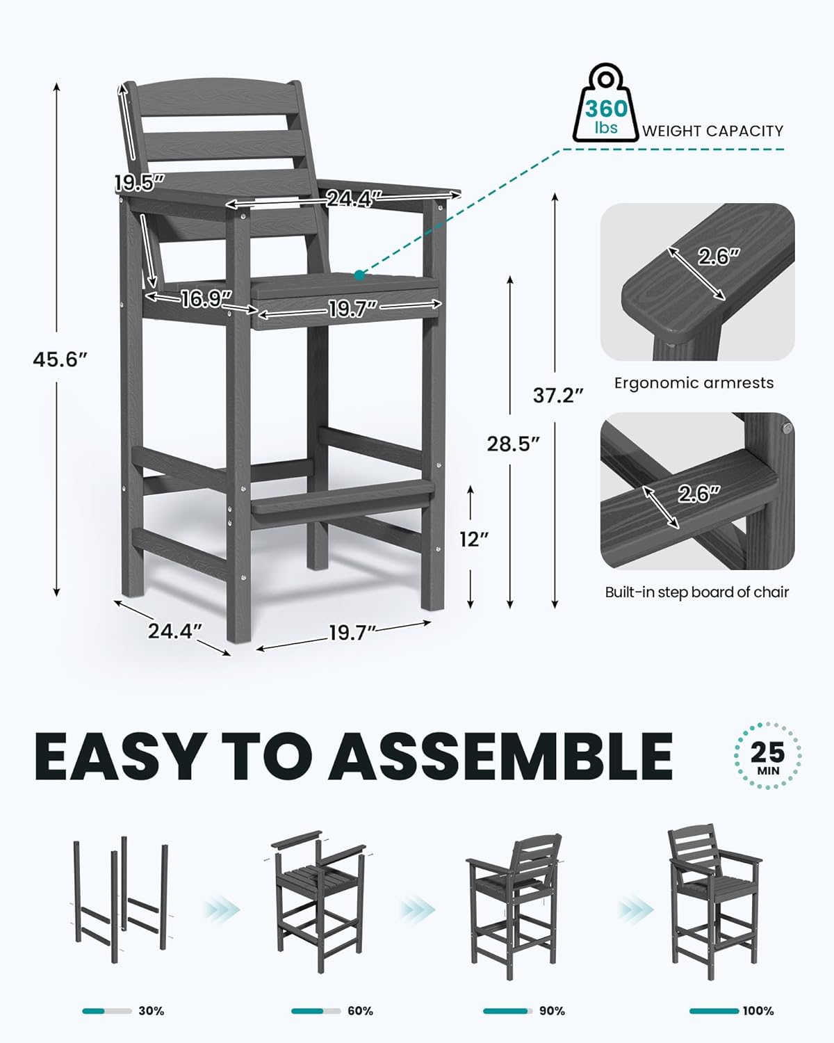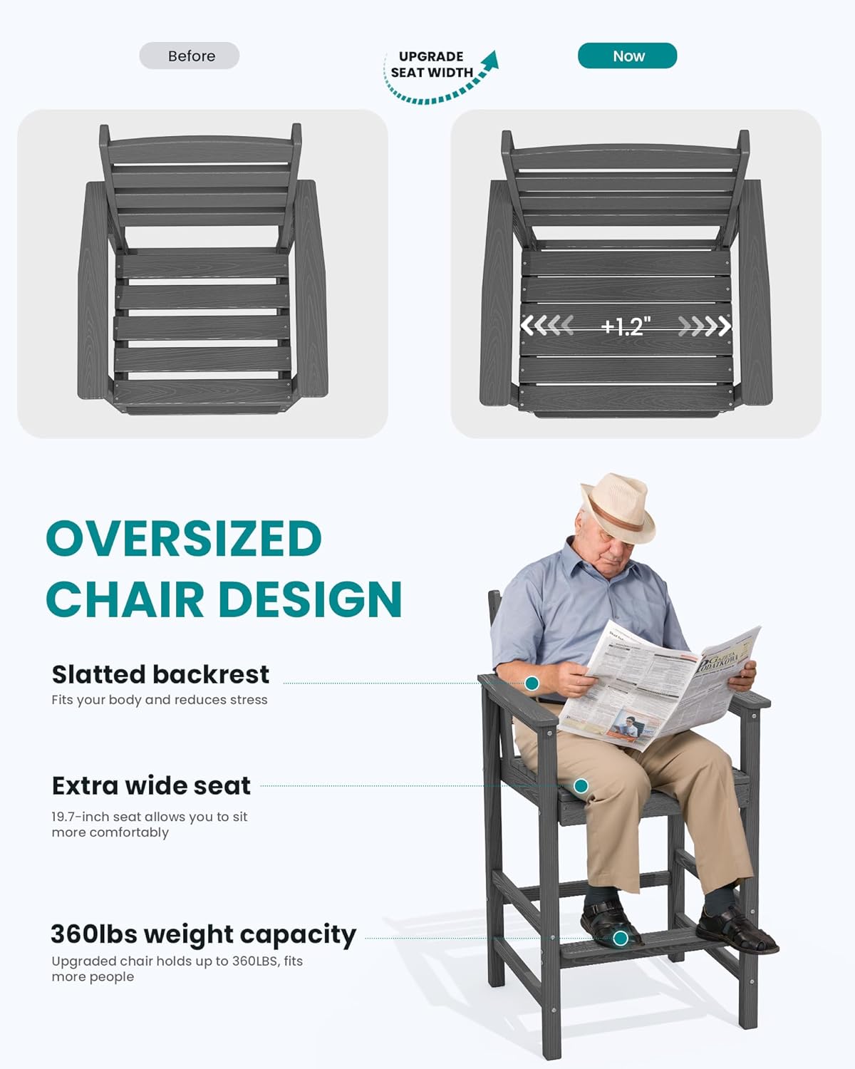 SERWALL Tall Adirondack Chairs Set of 2, Oversize Balcony Adirondack Chairs Set, Outdoor Bar Height Barstools Widened Chair Set for Bistro, Poolside, Garden, Gray