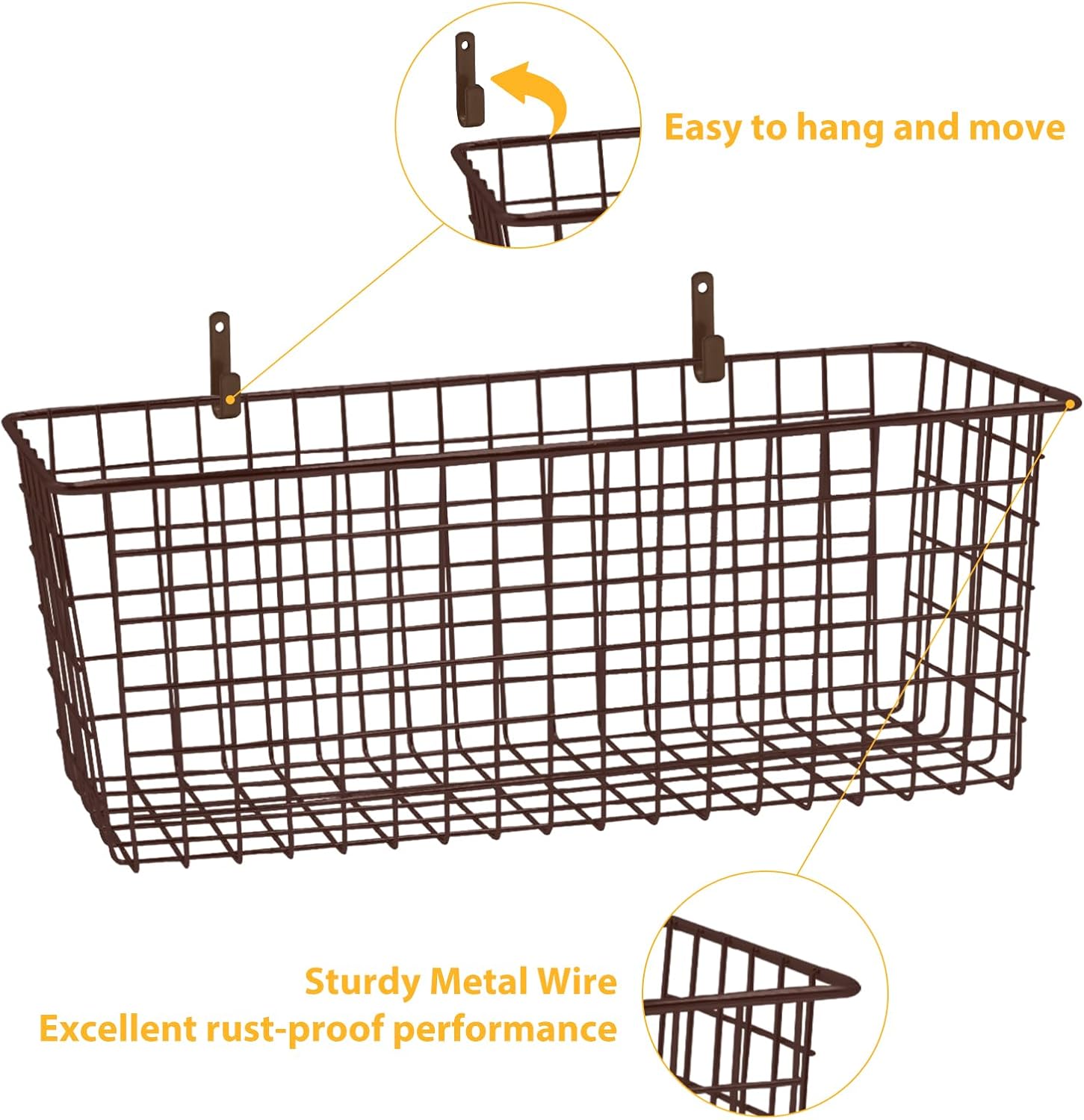 - Sturdy Metal Wire Baskets: These metal wall baskets are made of solid metal wire with anti-rust coating, sturdy and durable for long lasting. The wire baskets for organizing open design allows you to see the items inside the basket, which makes it easy to find the item you need. And easy to clean, just wipe clean with a soft damp cloth and dry towel.