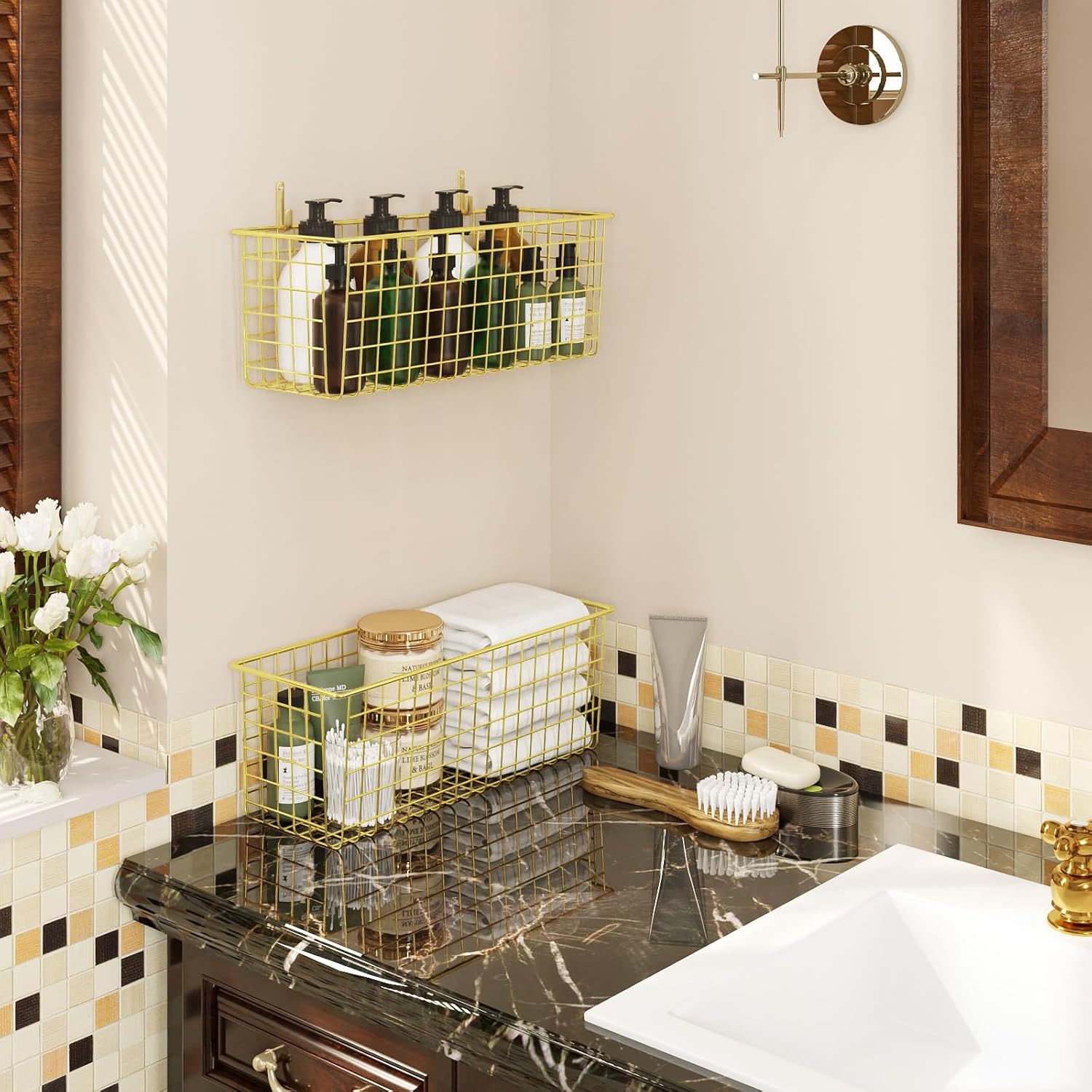 2 Sets Extra Large Hanging Wall Basket, Gold Metal Wire Baskets with Steel Hooks for Organizing, WallmountedFruit Vegetable Toy Snack Storage, Home Kitchen Bathroom Laundry Pantry Organizer