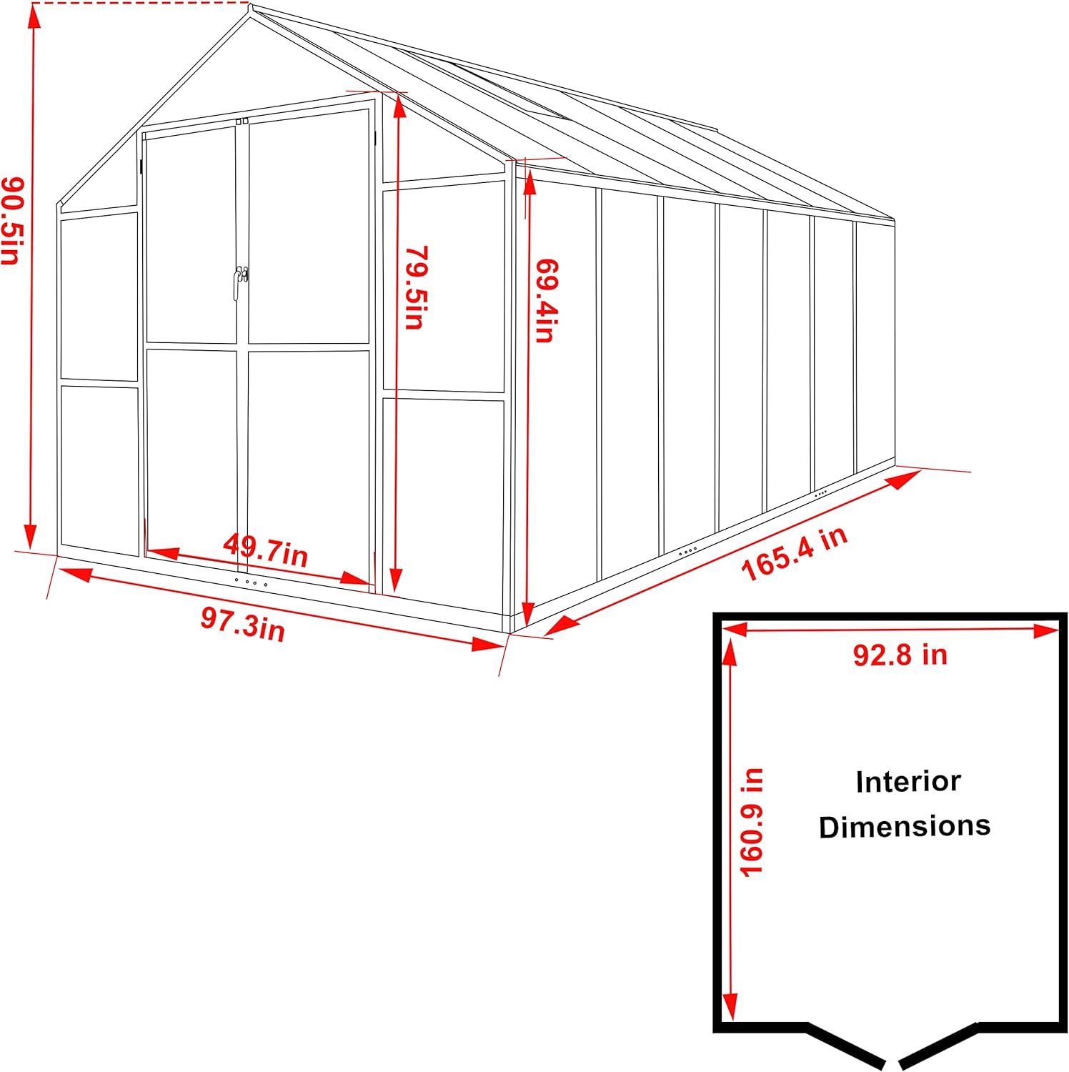 8x14 FT Green House for Outdoor, Polycarbonate Aluminum Walk-in Greenhouse Kit with Lockable Door and Adjustable Roof Vents, Backyard Garden in Winter, Gray
