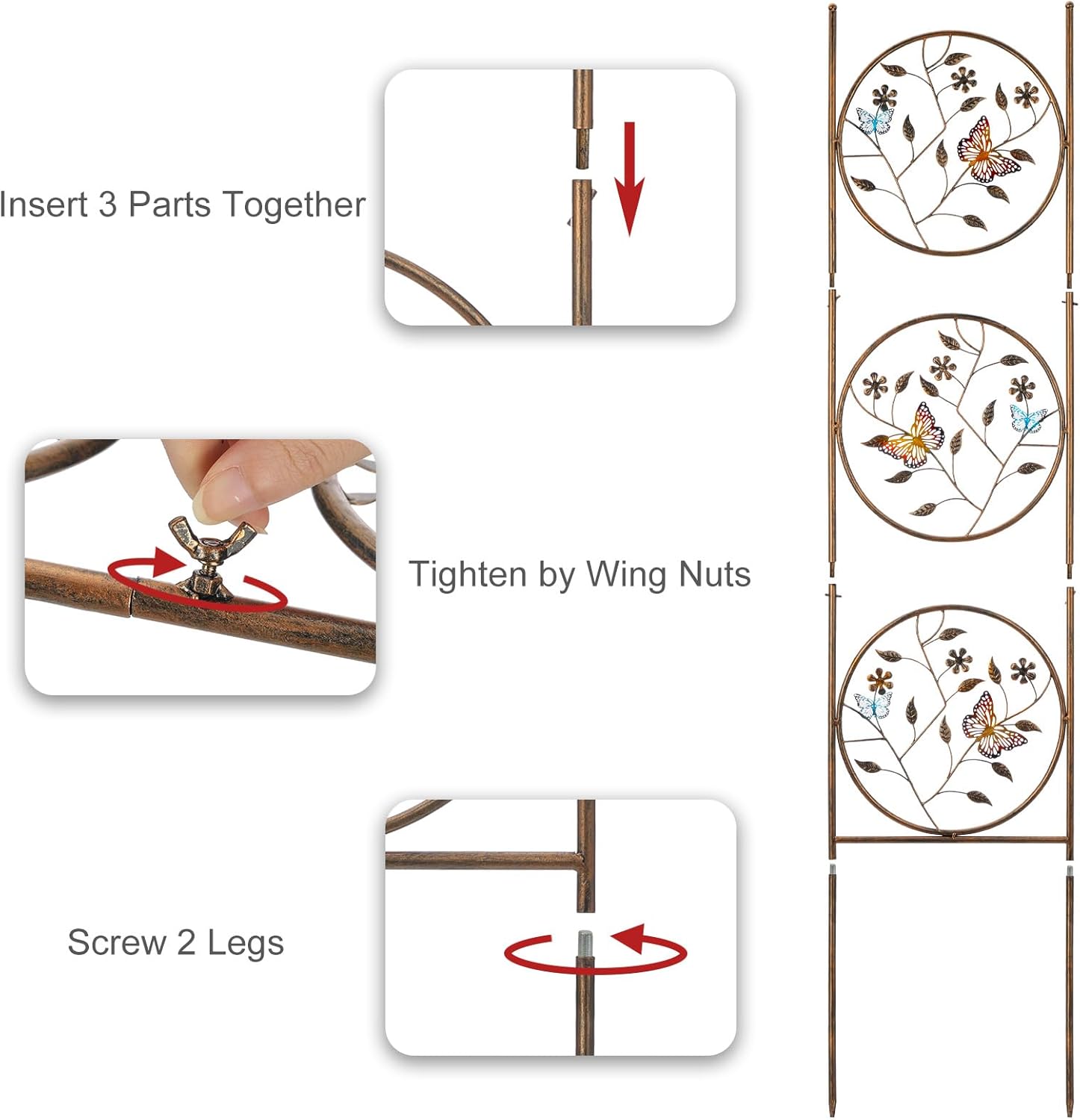 - Easy to Assemble: This pair of trellis is handcrafted and constructed of sturdy, it made from iron under a thick finish of bronze powder-coat. Easy installation is required, just insert 3 parts together, tighten by wing nuts and screw 2 legs on to stake into the ground or pots