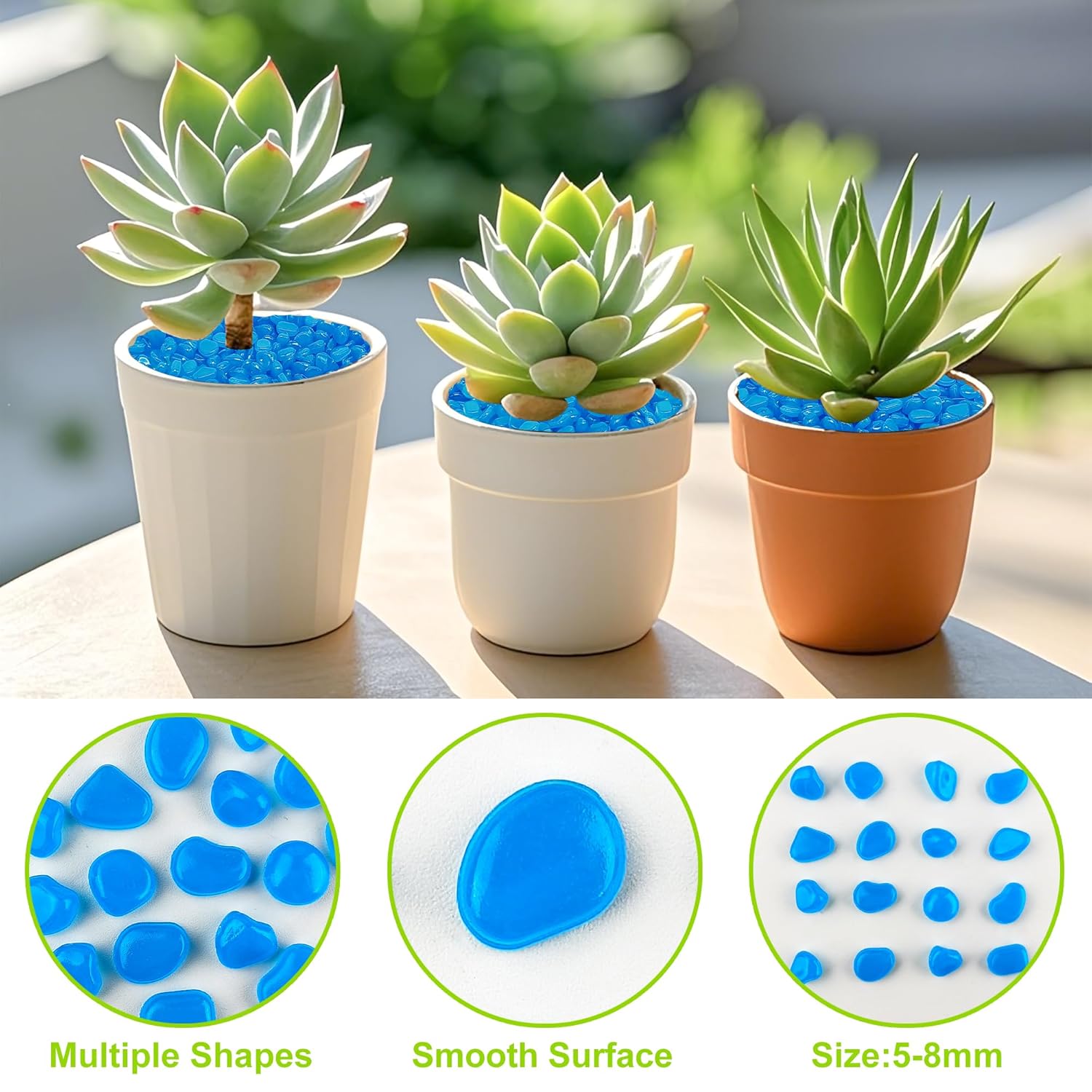 - Indoor/Outdoor Glowing Pebbles: different quantities can meet your different usage needs. 200pc are suitable for potted plants, succulent plant, and micro fairy garden. 500pc can be used in small fish tank, flower pots, vase. 1000pc are great for garden, lawn ,aquarium. 3000pc can be displayed well in yards, patio, walkways, driveway