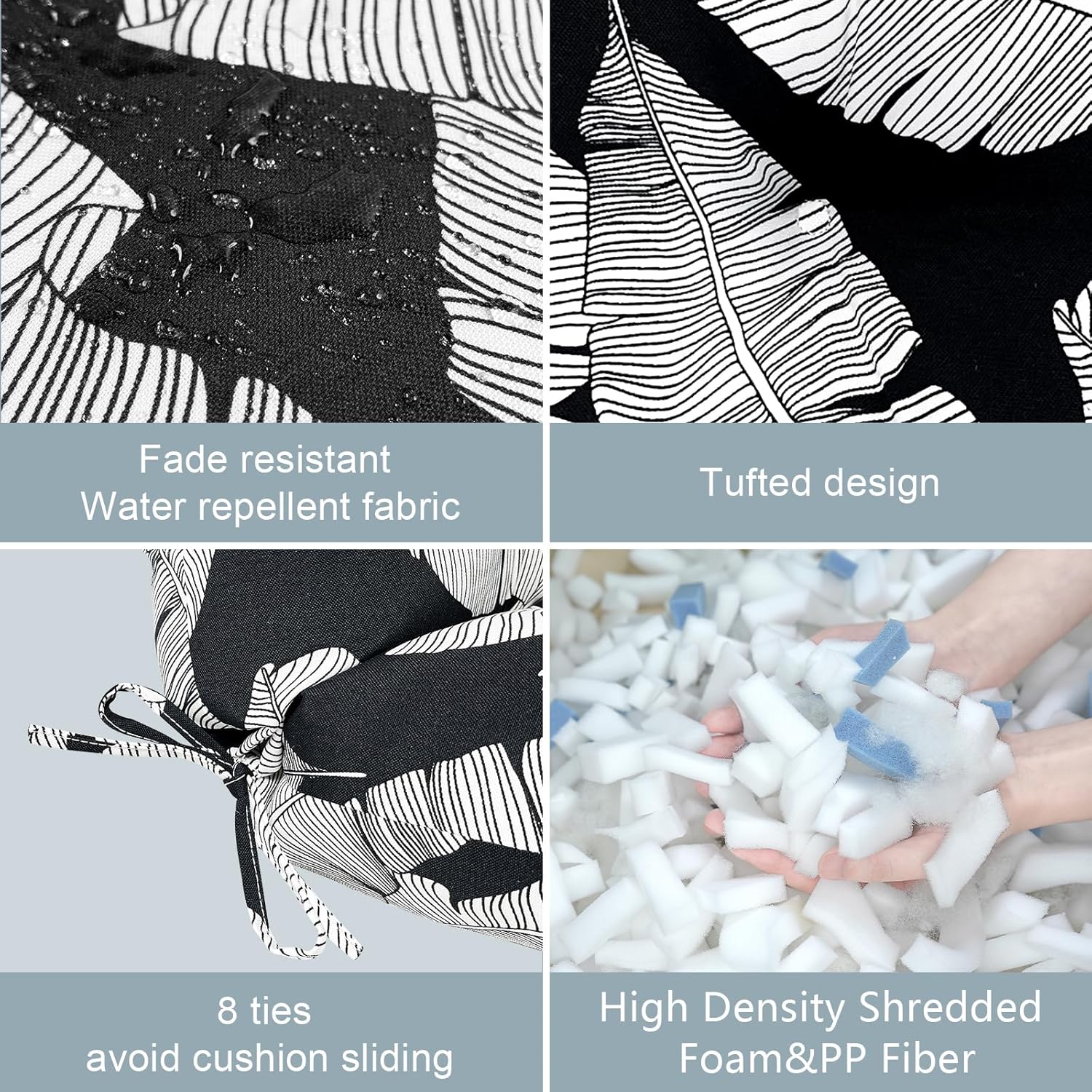 - Material: 100 percent durable polyester fabric and high-quality recyclable poly batting. It’s water repellent, fade resistant, dirt and stain resistant, won’t fade under the sun for 500 hours. It is filled with soft PP fiber, overstuffed construction for enhanced comfort and longevity.