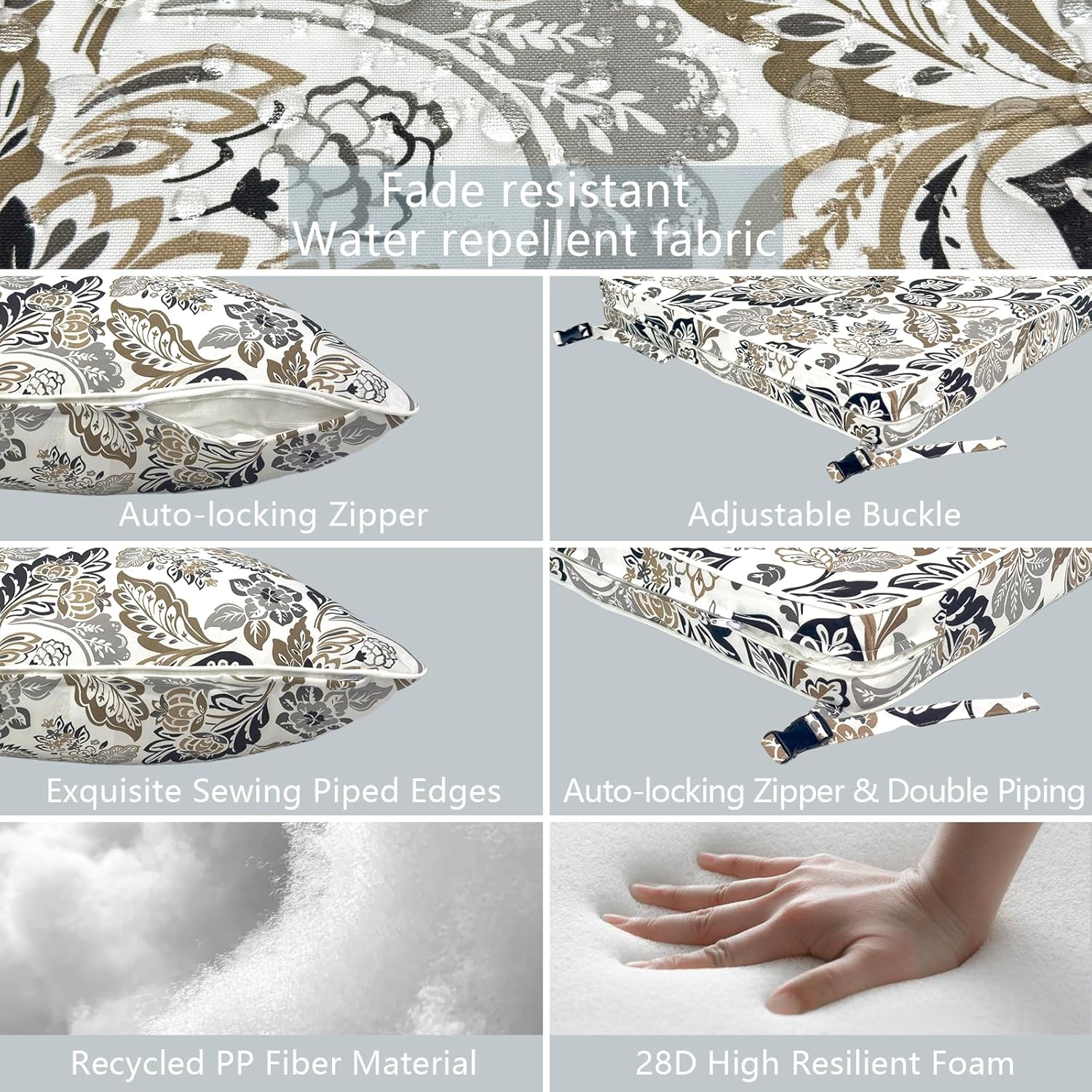 - ⭐Material: Made of 100% durable polyester fabric and soft filling material. It’s water repellent and fade-resistant. Won’t fading under the direct sunlight over 500 hours. Cushions are filled with 28D high resilient foama, overstuffed construction for enhanced comfort and longevity.