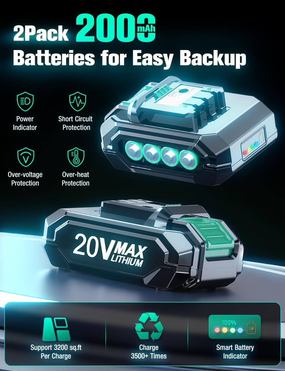 - đ±ă2*2000mAh Batteries with Smart Power IndicatorăTwo replaceable batteries allow you to switch to a fully charged battery when another battery runs out of power, without waiting for a charge. Also, by alternating between the two batteries, the wear on each battery is reduced, and the battery life can be extended by 150%. The batteries that come with KIMO battery powered leaf blower and lawn trimmers are equipped with a battery indicator light, so you will never be out of power while using them.