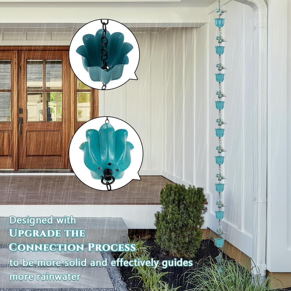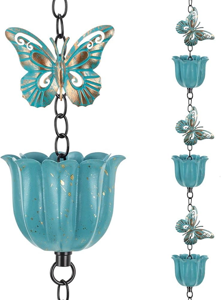 - Lotus Rain Chain: The 8.2-foot rain chain consists of 10 lotus cups and butterfly decorations, hanging on the gutter, which can not only effectively guide the flow of rainwater, but also decorate the eaves. Whether sunny or rainy, it can add elegance to the appearance of your house