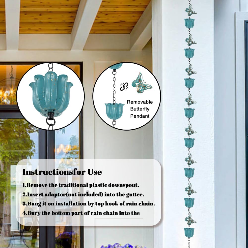 - Adjustable Rain Chain: The lotus rain chain is 8.2 inches long. The chain can be disassembled to shorten the length or assemble two rain chains to increase the length, which can be adjusted according to the height of your own house. After receiving the goods, you can hang the butterfly on the rain chain on the chain as needed