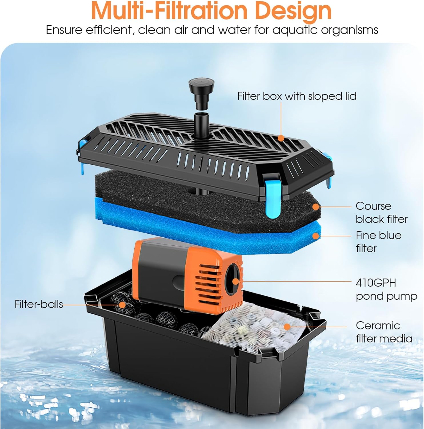 - â˛ăMulti-Protection Filtration SystemăSolar Pond Pump built-in dry burning protection prevents motor damage, while the filter sponges, bio-balls and ceramic filtrations create an efficient multi-filtration zone. This integrated system significantly enhances water clarity in ponds, water gardens, and fountains, ensuring long-lasting performance and minimal upkeep.This design provides a reliable solution for maintaining crystal-clear water in various water features.