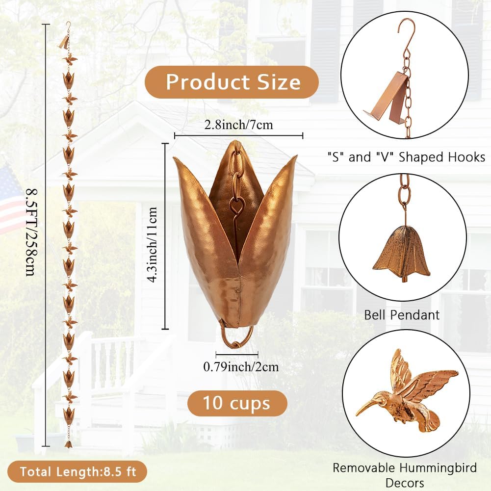 Rain Chains for Gutters, 8.5 Ft Rain Water Chain with 10 Tulip Cups & Detachable Hummingbird Decor, Adjustable Gold Rain Catcher Chain, Replacement for Downspout