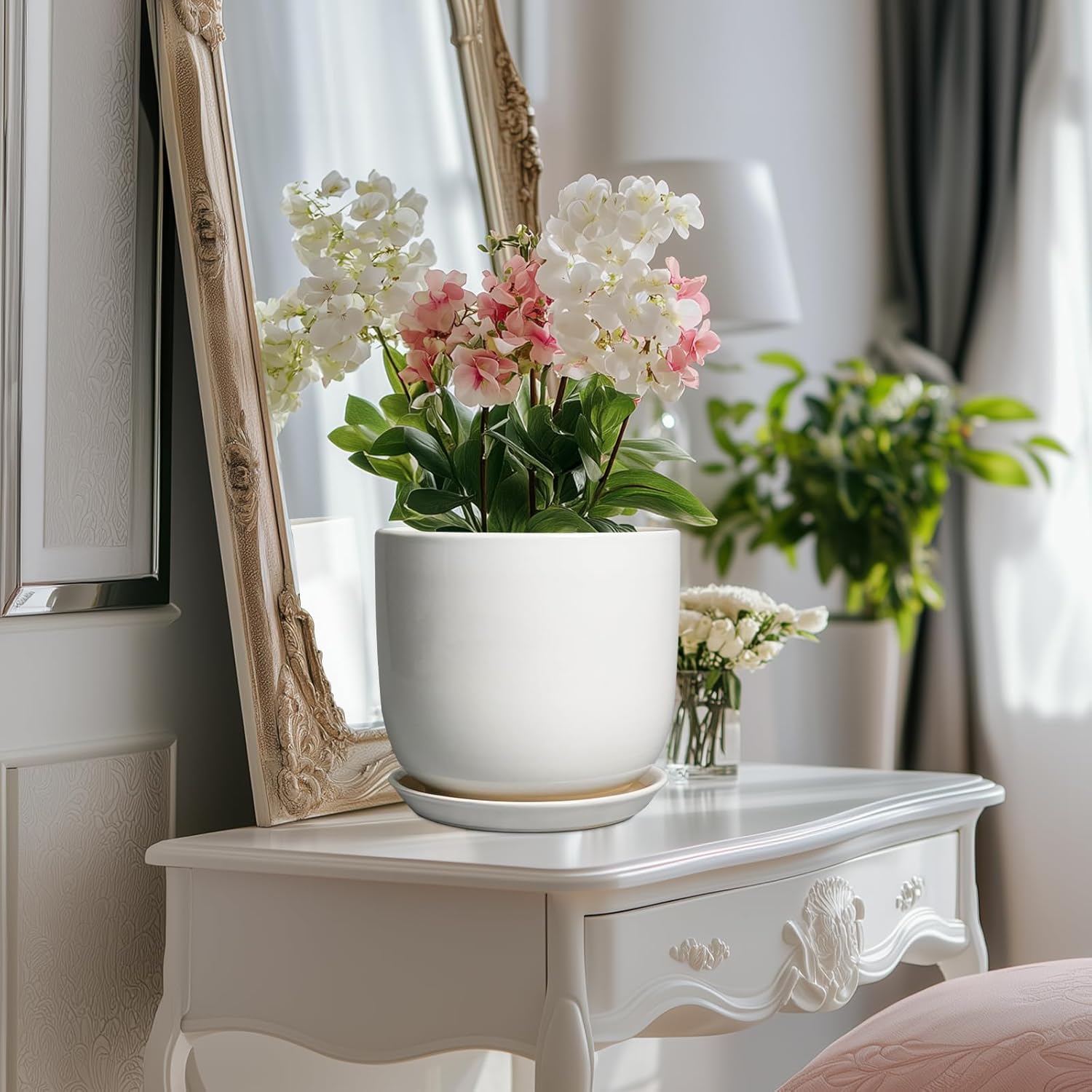 Ceramic Plant Pot - Modern 8 Inch Round Planter for Indoor Outdoor Plants with Drainage Hole and Saucer, Home House Room Office Decor, White