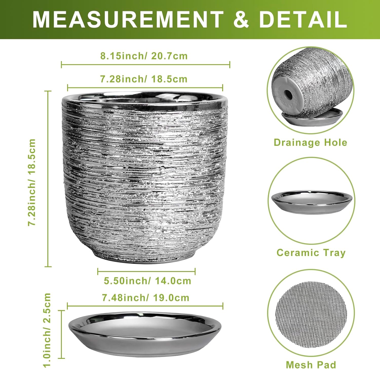 - Size of Silver Planter: Each 8 inch plant pot is 8.15β D x 7.68β H. A matching saucer to prevent leaks, allowing you to place plant pot anywhere with confidence