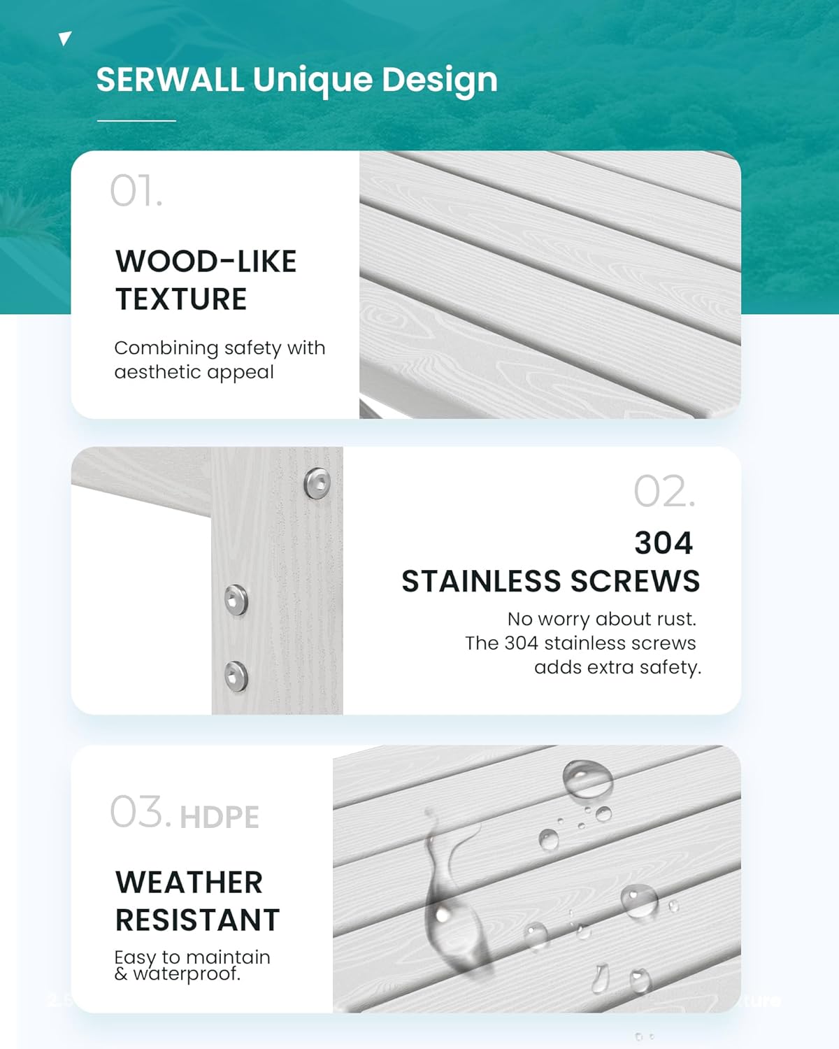 - Waterproof & Fast-drying โ The slatted HDPE material is designed to shelter from rain and dry quickly, so you don't have to wait long after a storm to use it. Ideal outdoor furniture for poolside.