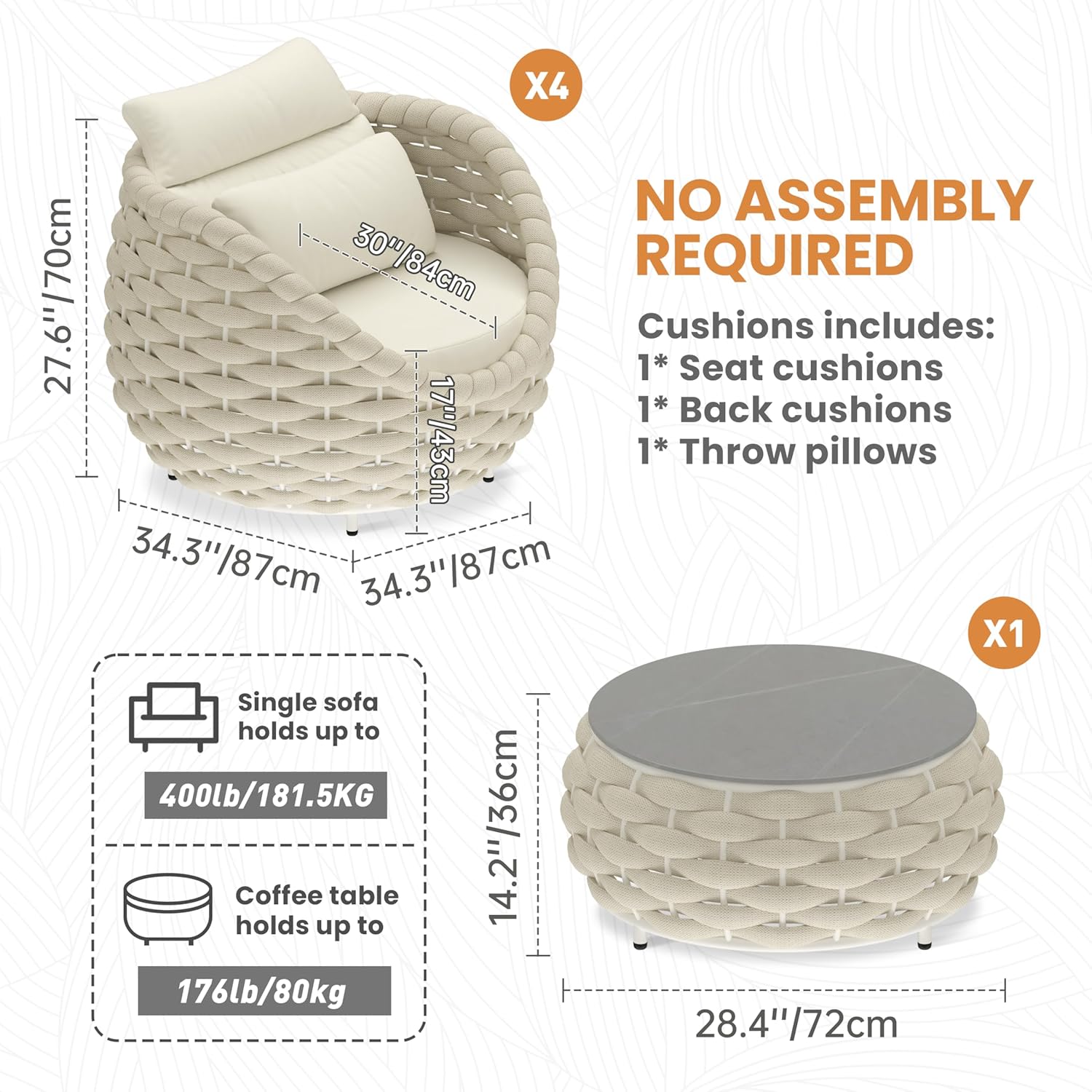 - Woven rope patio set includes: 4*sofa armchairs, 1*coffee table. Size: Single sofa: 34.3''(L)X34.3''(W)X27.6''(H) holds up to 400 lbs/181.5kg; Side table: 28.4''(L)X28.4''(W)X14.2''(H) holds up to 176 lbs/80kg. Color: Beige rope and beige fabric