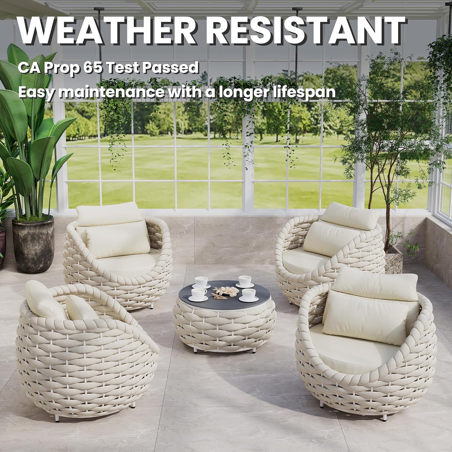 - Furniture set is crafted from reinforced rust-free aluminum alloy frame, wrapped in hand woven olefin rope. The 5 pieces all weather patio upholstered conversation set resists to UV, rain, wind, salt water. Perfect for indoor outdoor even arid or coastal areas
