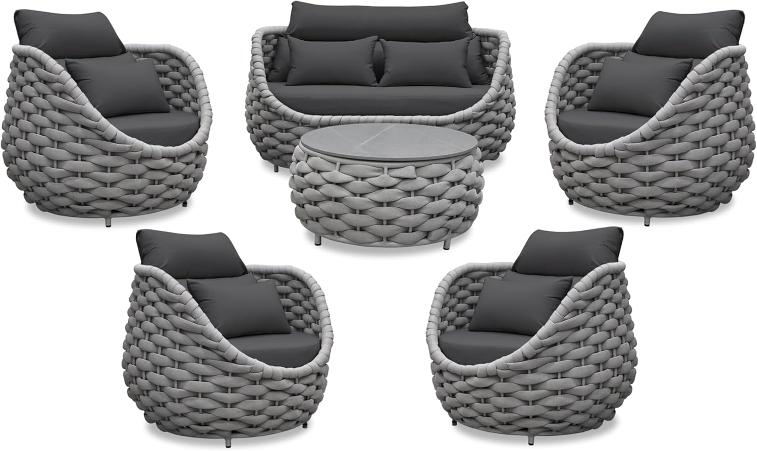 - Furniture set is crafted from reinforced rust-free aluminum alloy frame, wrapped in hand woven textilene rope. The 6 pieces all weather patio upholstered conversation set resists to UV, rain, wind, salt water. Perfect for indoor outdoor even arid or coastal areas