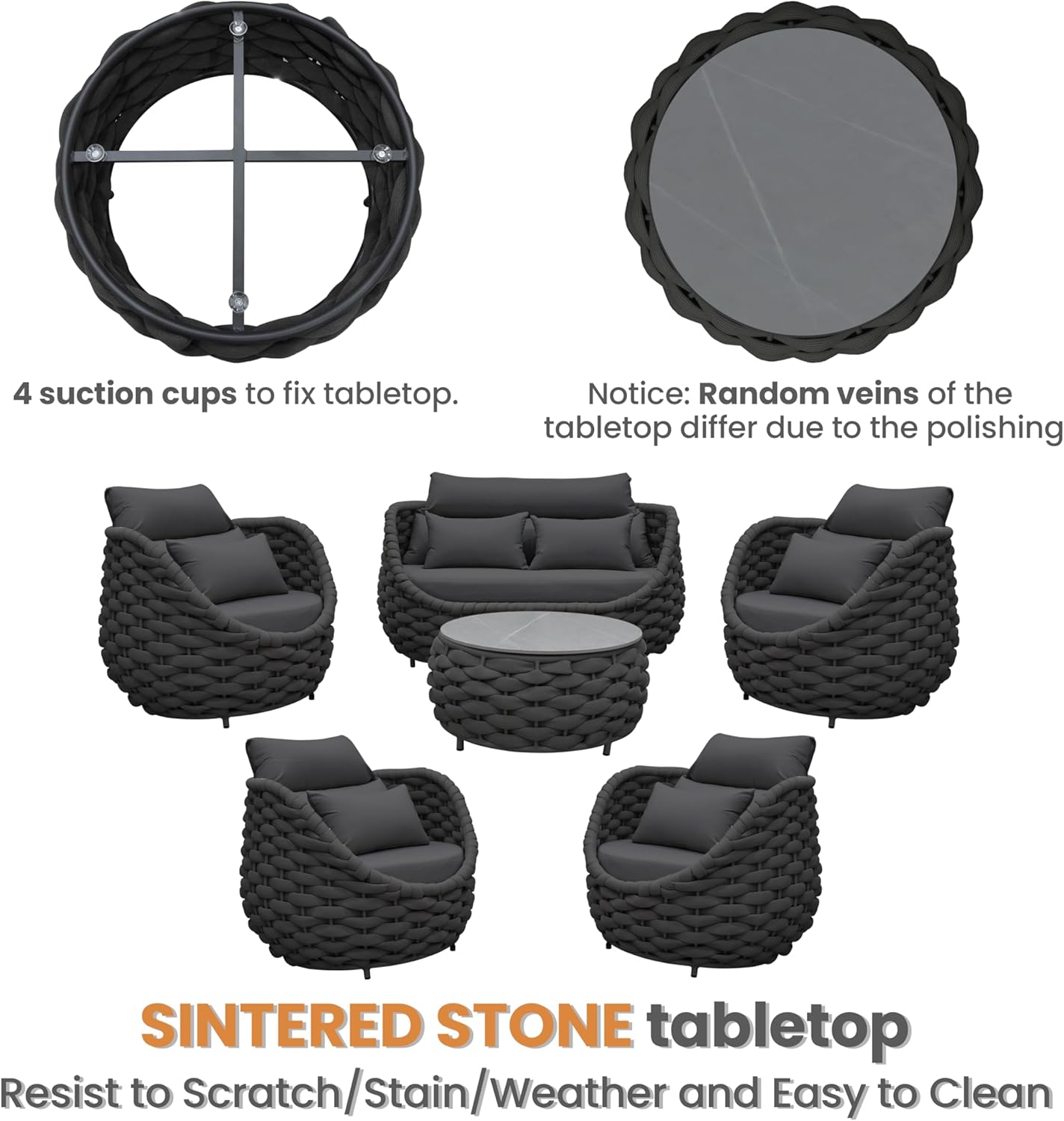 - Furniture set is crafted from reinforced rust-free aluminum alloy frame, wrapped in hand woven textilene rope. The 6 pieces all weather patio upholstered conversation set resists to UV, rain, wind, salt water. Perfect for indoor outdoor even arid or coastal areas