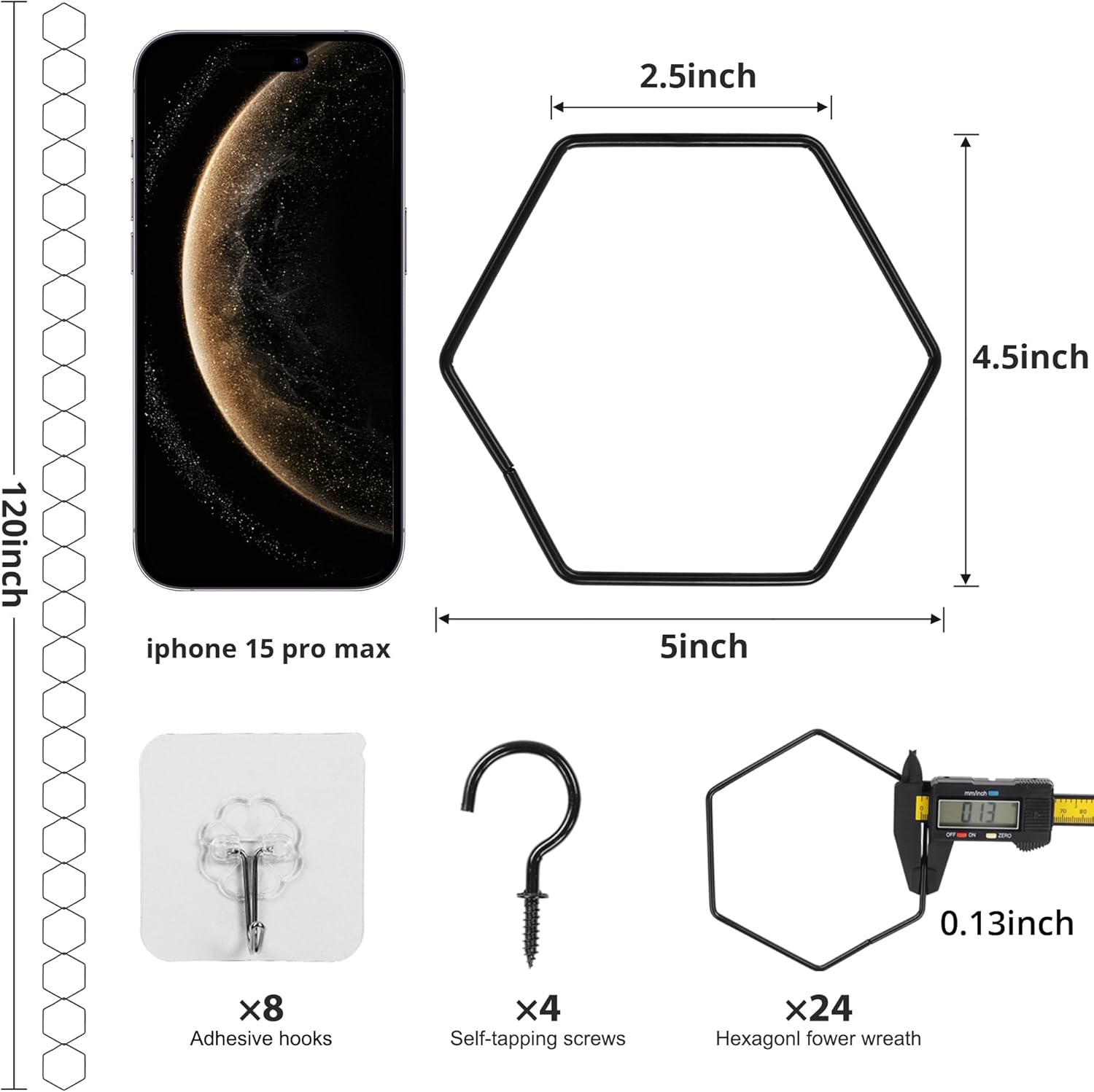 - Extended Size and Complete Accessories: Our plant climbing trellis includes 24 hexagons, 6 transparent hooks, and 4 black metal question mark hooks. The two types of hooks are compatible with various surfaces such as tiles and walls, meeting multiple hanging needs. With a total length of 120 inches, the extended size allows your plants to climb higher with ease